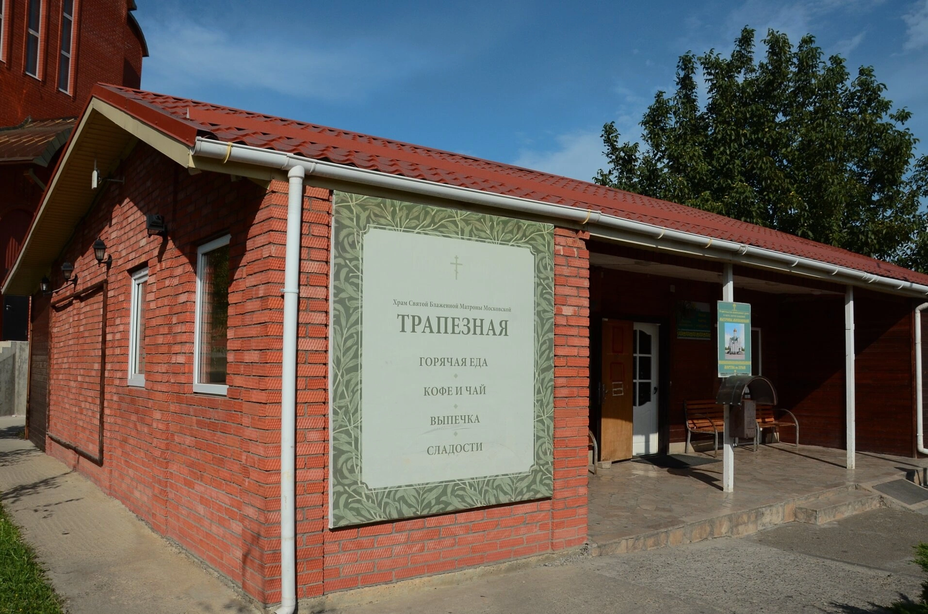 На фотографии запечатлена трапезная, относящаяся к храмовому комплексу в честь святой блаженной Матроны Московской, расположенному в городе Краснодаре. Это одноэтажное здание, возведённое из красного кирпича и покрытое двускатной кровлей из красной черепицы, выполняет важное служение по обеспечению паломников и прихожан пищей. На фасаде строения размещена светлая вывеска, на которой обозначено его предназначение: «Трапезная», «Горячая еда», «Кофе и чай», «Выпечка», «Сладости».
