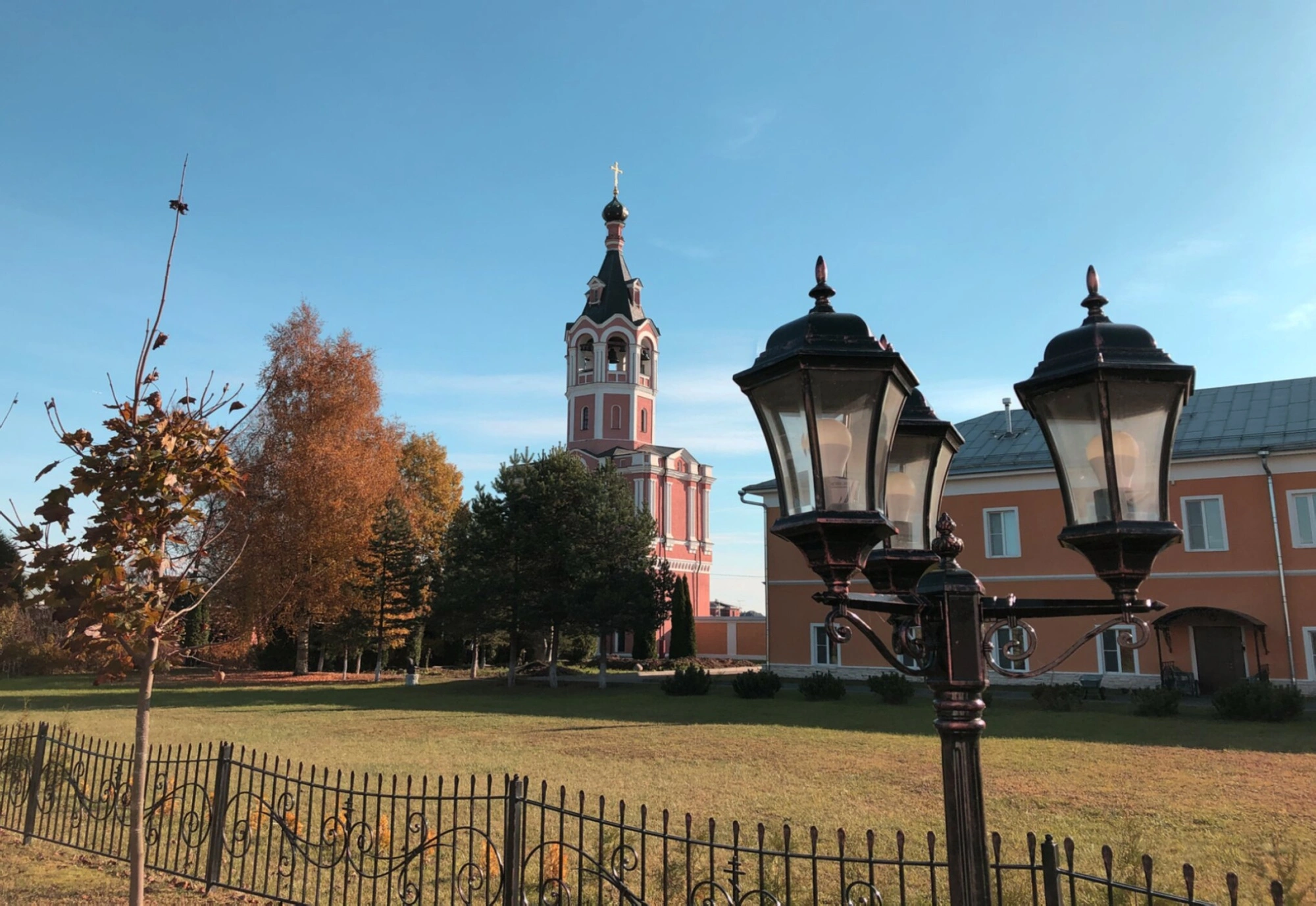 На переднем плане фотографии виднеется изящный кованый забор, ограждающий святую территорию монастыря, и традиционный фонарный столб. За оградой простирается ухоженный газон и деревья, создающие атмосферу благолепия и умиротворения. Центральное место в композиции занимает высокая колокольня — архитектурная доминанта всего монастырского ансамбля, выполненная в лучших традициях русского церковного зодчества.