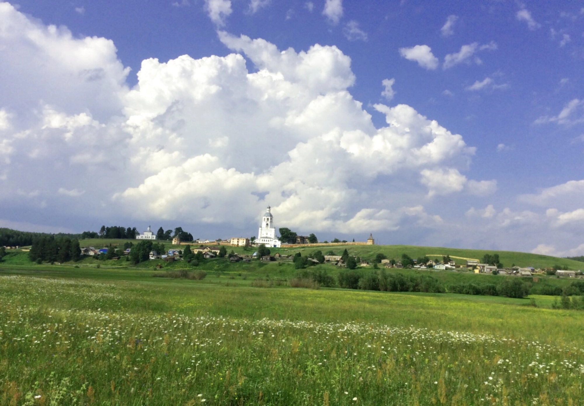 На переднем плане фотографии простирается цветущее луговое разнотравье с белыми полевыми цветами, обрамляющее подходы к святому месту. У подножия холма виднеются скромные деревянные дома села Ульяново, составляющие единый гармоничный пейзаж с монастырским комплексом.