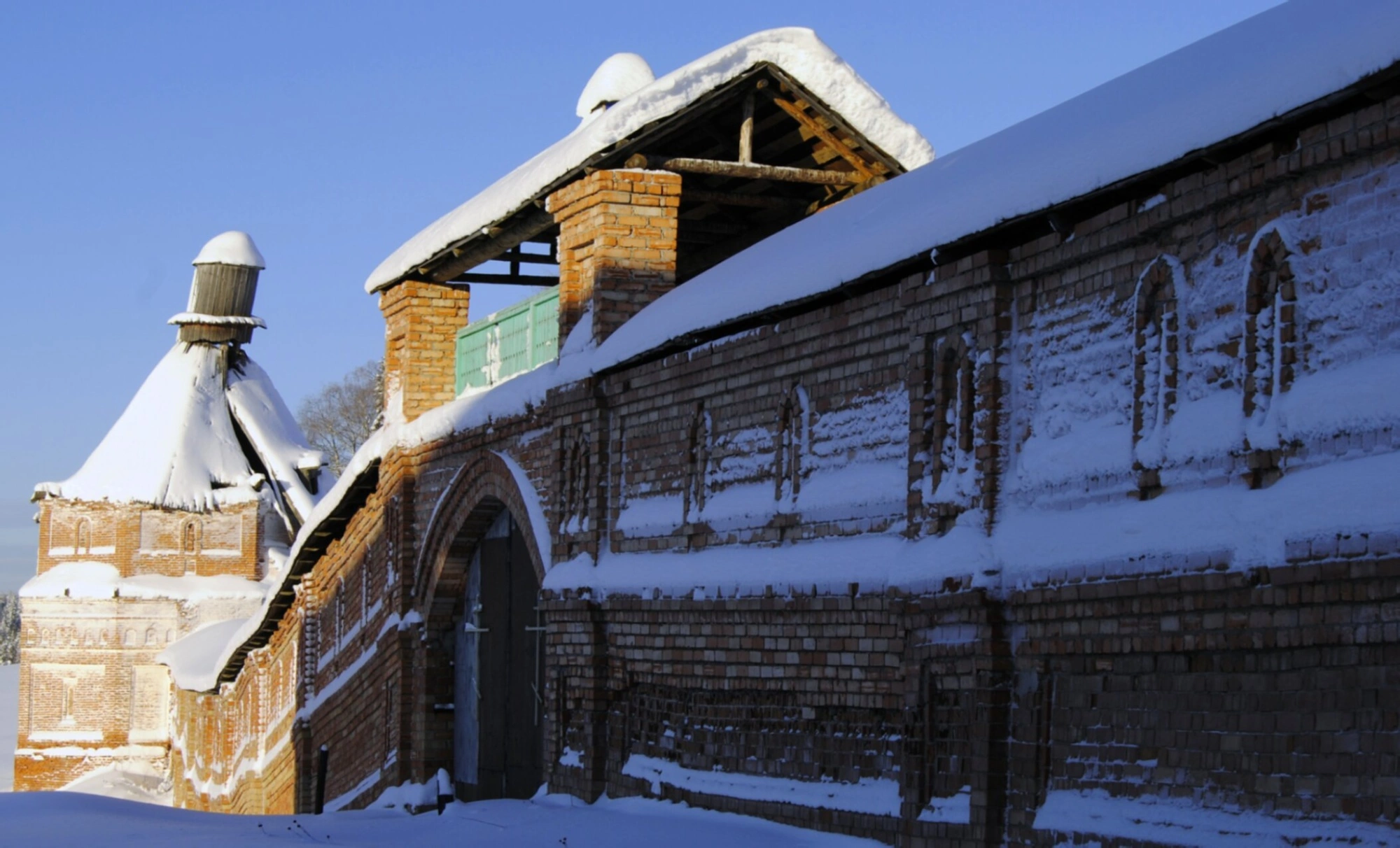 На фотографии запечатлён Троице-Стефановский Ульяновский мужской монастырь, расположенный в селе Ульяново Усть-Куломского района Республики Коми. Снежный покров, укутавший древние кирпичные постройки, придаёт святой обители особое благолепие и величие, подчёркивая её строгую северную красоту. Архитектурный ансамбль, видный на снимке, включает в себя монастырские стены, храмовые здания и хозяйственные постройки, возведённые в русском стиле во второй половине XIX века.