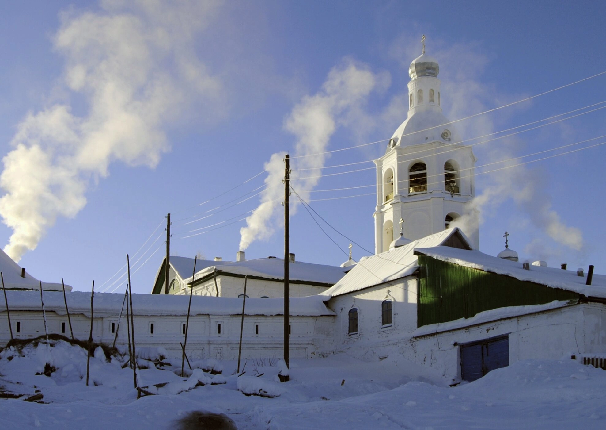 На снимке также видны линии электропередач, что символизирует собою соединение древних традиций и современной жизни, в которой продолжает свою деятельность ставропигиальный монастырь. Эта фотография не просто фиксирует вид монастыря, но передаёт нам чувство незыблемости веры, спокойствия и величавой красоты православной святыни, пребывающей в единении с суровой природой северного края.