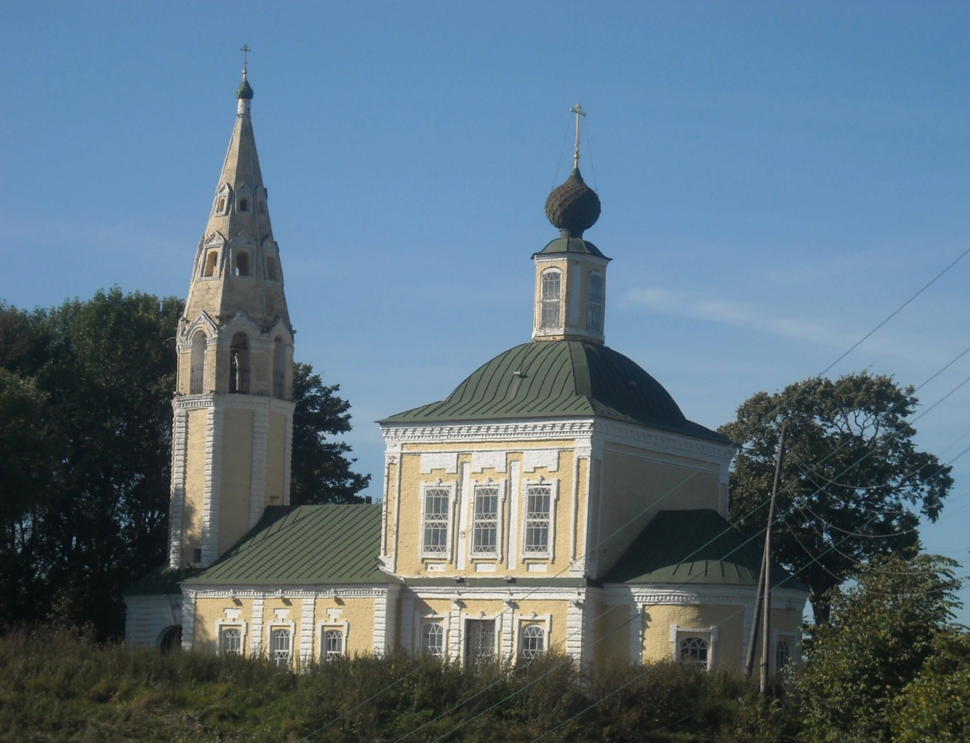 Храм гармонично вписан в природный ландшафт, возвышаясь на холме, который круто спускается к волжскому берегу. Местоположение на бывшем погосте, окружённое зеленью, придаёт ему особую умиротворённость и величие. Здание церкви одноэтажное, с особой надстройкой над просторной трапезной частью. Архитектурный ансамбль отличает высокая шатровая колокольня, устремлённая в небо, и массивное купольное перекрытие трапезной, увенчанное высоким восьмигранным барабаном с четырьмя арочными окнами и изящным луковичным куполом.