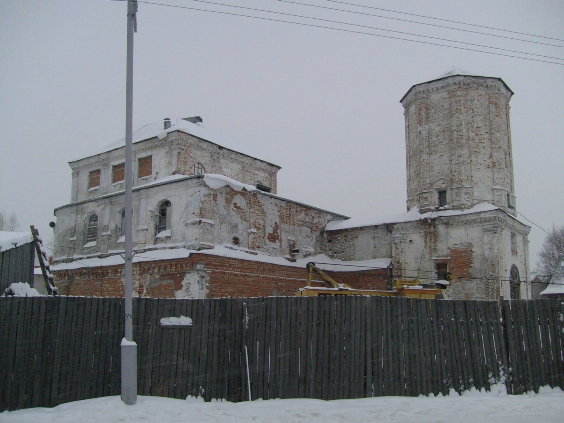 С правой стороны от основного объёма храма возвышается монументальная круглая башня-колокольня, увенчанная куполом и православным крестом, устремлённым в небо. На переднем плане фотографии виднеется деревянный забор и глубокий слой снега, покрывающий землю, что создаёт ощущение умиротворённости и строгой торжественности.