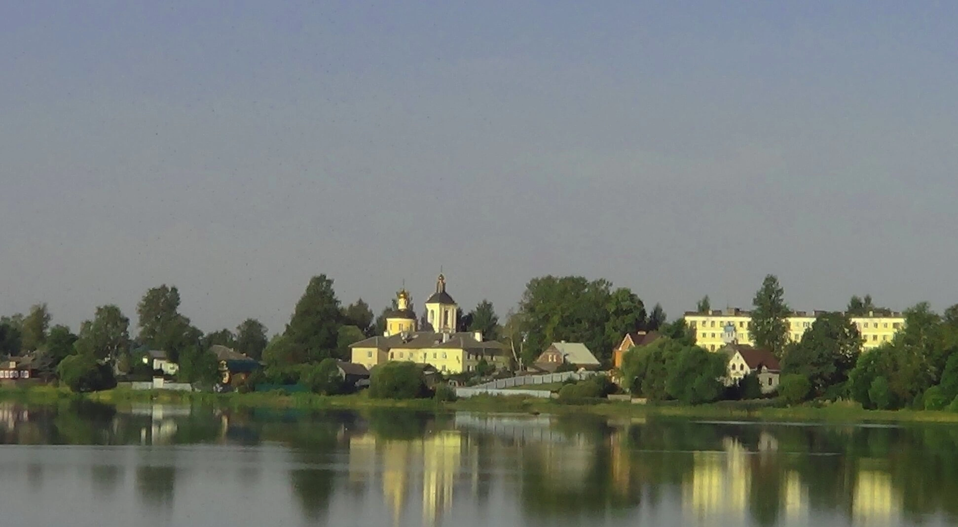На представленной фотографии запечатлён величественный образ Свято-Троицкой церкви, расположенной в городе Бологое Тверской области. Храм возвышается на берегу живописного озера Бологое, создавая гармоничный архитектурный ансамбль с окружающим природным ландшафтом.