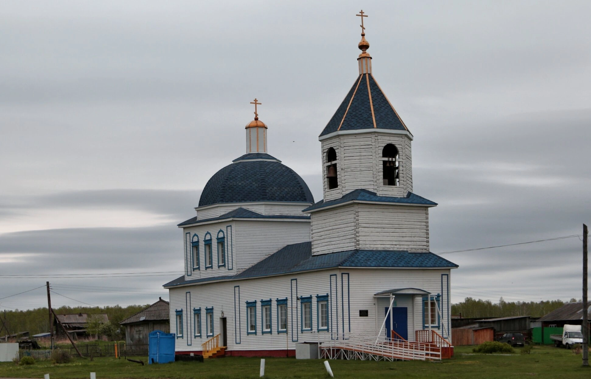 На фасаде здания хорошо различимы оконные проёмы, обрамлённые синими наличниками, характерными для местных строительных традиций. Вход в храм оформлен деревянным крыльцом, оборудованным пандусом для удобства прихожан. Архитектурный ансамбль дополняют окружающие церковь деревянные постройки, типичные для сельской местности Западной Сибири.
