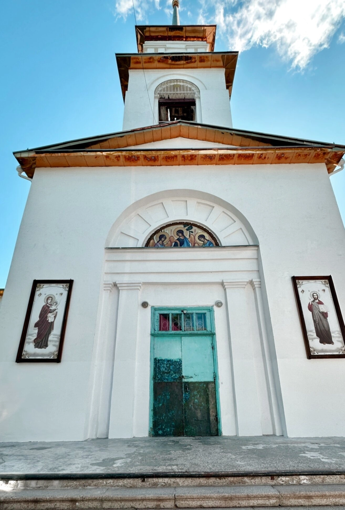 Белоснежное здание храма, увенчанное златыми куполами, сияет под небом Урала, воплощая традиции русского церковного зодчества. Над главным входом размещены почитаемые фрески, призывающие верующих к молитве. Высокая колокольня, устремлённая ввысь, дополняет благолепие святого места.