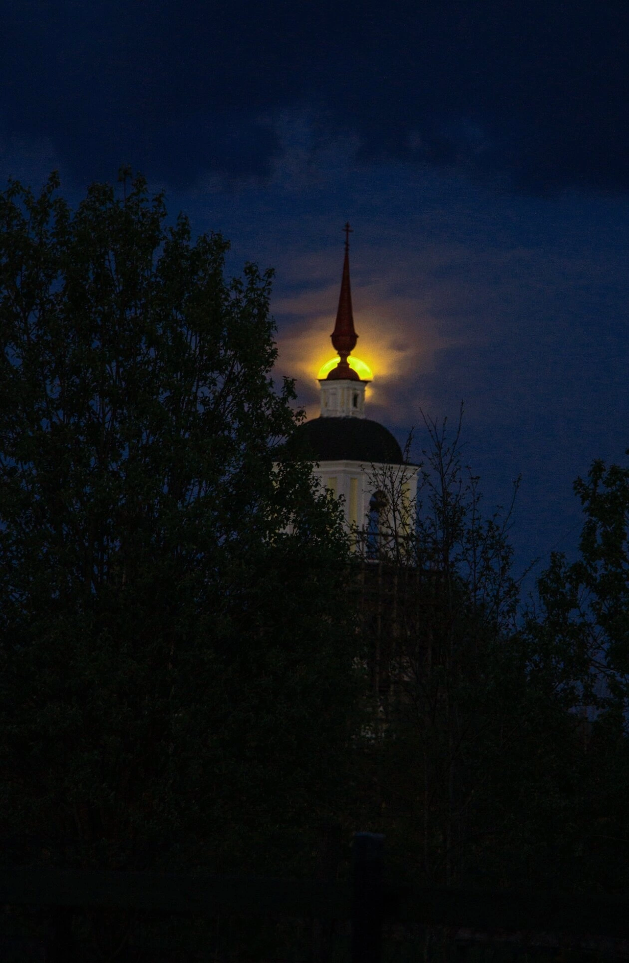 Церковь возвышается в ночной темноте, её белокаменные стены мягко высвечиваются в окружающем мраке. Архитектурный облик храма соответствует традициям северного русского зодчества. Над основным объёмом здания возносится тёмный купол, увенчанный изящным красным шпилем с православным крестом, устремлённым в небеса.