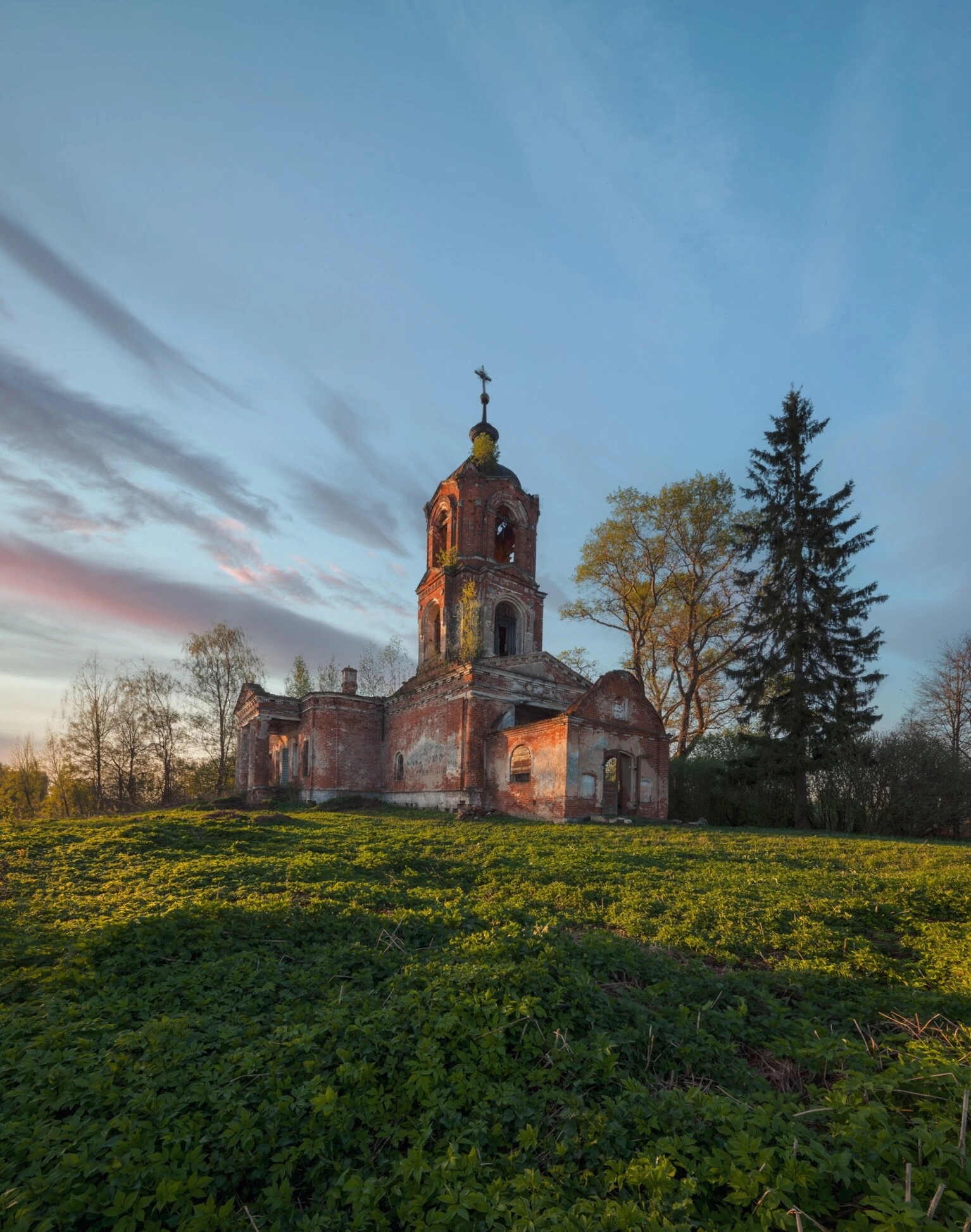 На фотографии церковь изображена на фоне вечернего неба с облаками, что символично отражает временность земного бытия и вечность духовных ценностей. Несмотря на разрушения, храм продолжает возноситься к небу своими куполами и колокольней, напоминая о непреходящей значимости православной веры для русского народа.