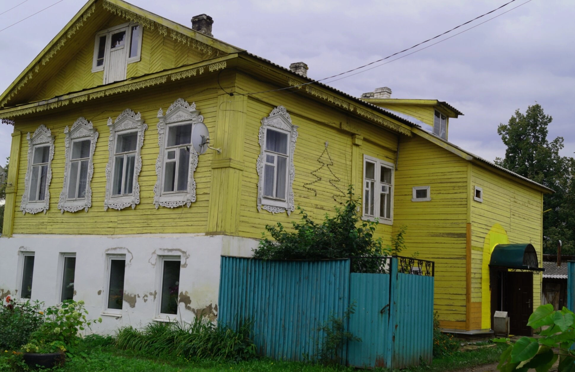 На представленной фотографии запечатлена Троицкая церковь, расположенная в поселке Нерль Калязинского района Тверской области. Этот деревянный православный храм представляет собой двухэтажное здание, окрашенное в желтый цвет с белым цоколем. Архитектура храма отличается традиционными для русского зодчества элементами, включая резные белые наличники на окнах второго этажа и под кровлей.