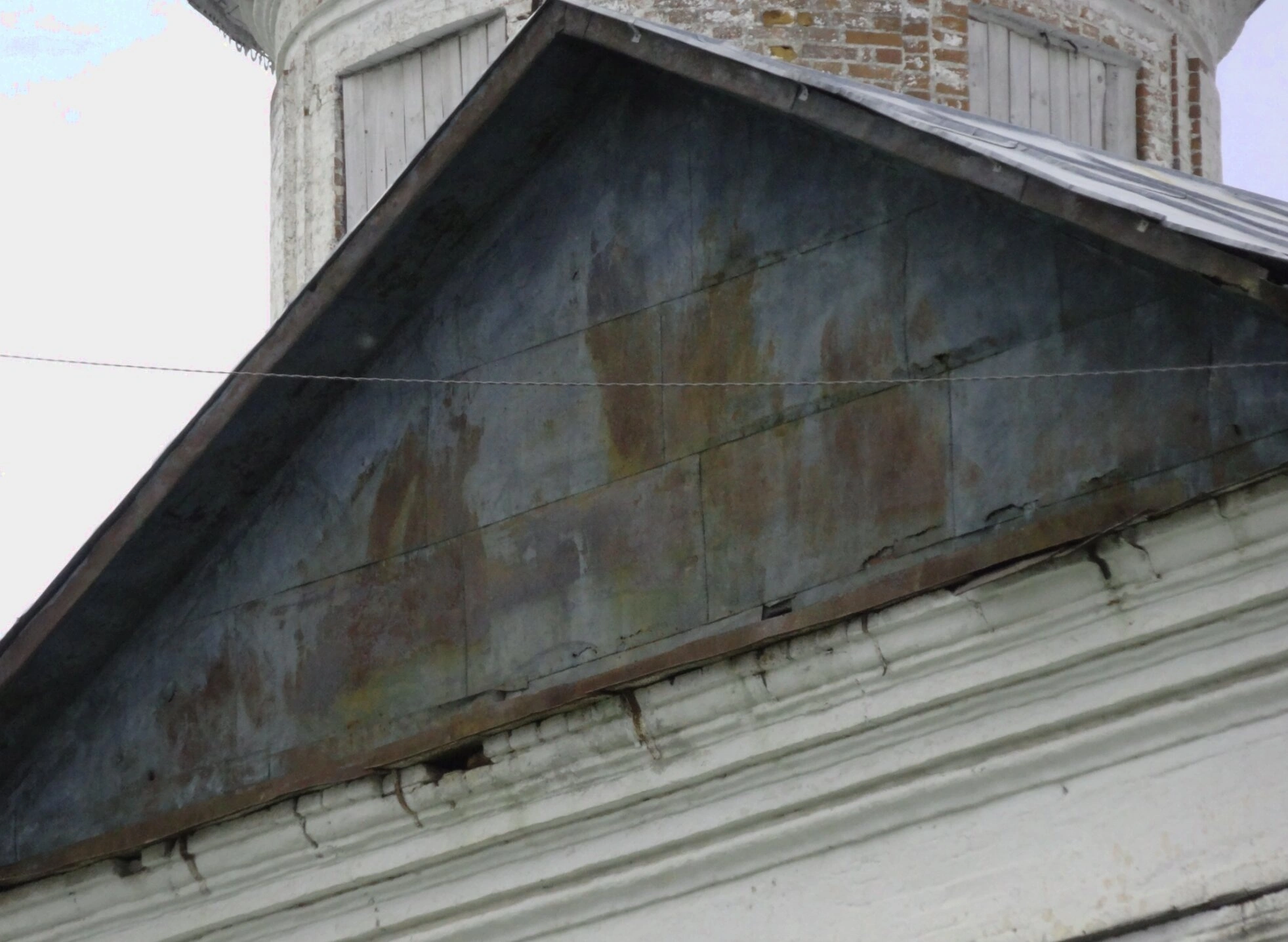 На фотографии запечатлена Троицкая церковь, расположенная в селе Острецово Ивановской области. Храм освящён в честь Покрова Пресвятой Богородицы и является образцом русского православного зодчества. На переднем плане изображён треугольный щипец, характерный для средневековой архитектуры Северной Европы и традиционно используемый в русском церковном строительстве. Щипец обшит листовой жестью, которая, несмотря на следы естественного старения и коррозии, продолжает выполнять свою защитную функцию. Подобная обшивка фронтонов жестяными листами, толщина которых обычно варьируется от 0,18 до 0,36 мм, широко применялась в России для сохранения деревянных конструкций от воздействия влаги и ветра.