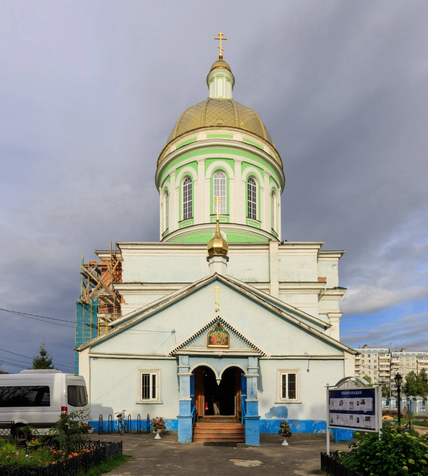 На снимке храм предстаёт в окружении мирской жизни, что символично отражает его роль в городе. Слева видны строительные леса, говорящие о непрекращающихся трудах по сохранению и украшению дома Божия. Архитектура храма, выполненная в стиле классицизма, отличается строгостью и благородством форм. Центральный объём с высоким световым барабаном и золочёной главой, увенчанной крестом, доминирует в композиции. Фасад украшает скромный портик над входом. Перед церковью находится аккуратная огороженная территория, а на заднем плане виднеются городские жилые дома, напоминая о том, что храм является духовным средоточием для множества людей.