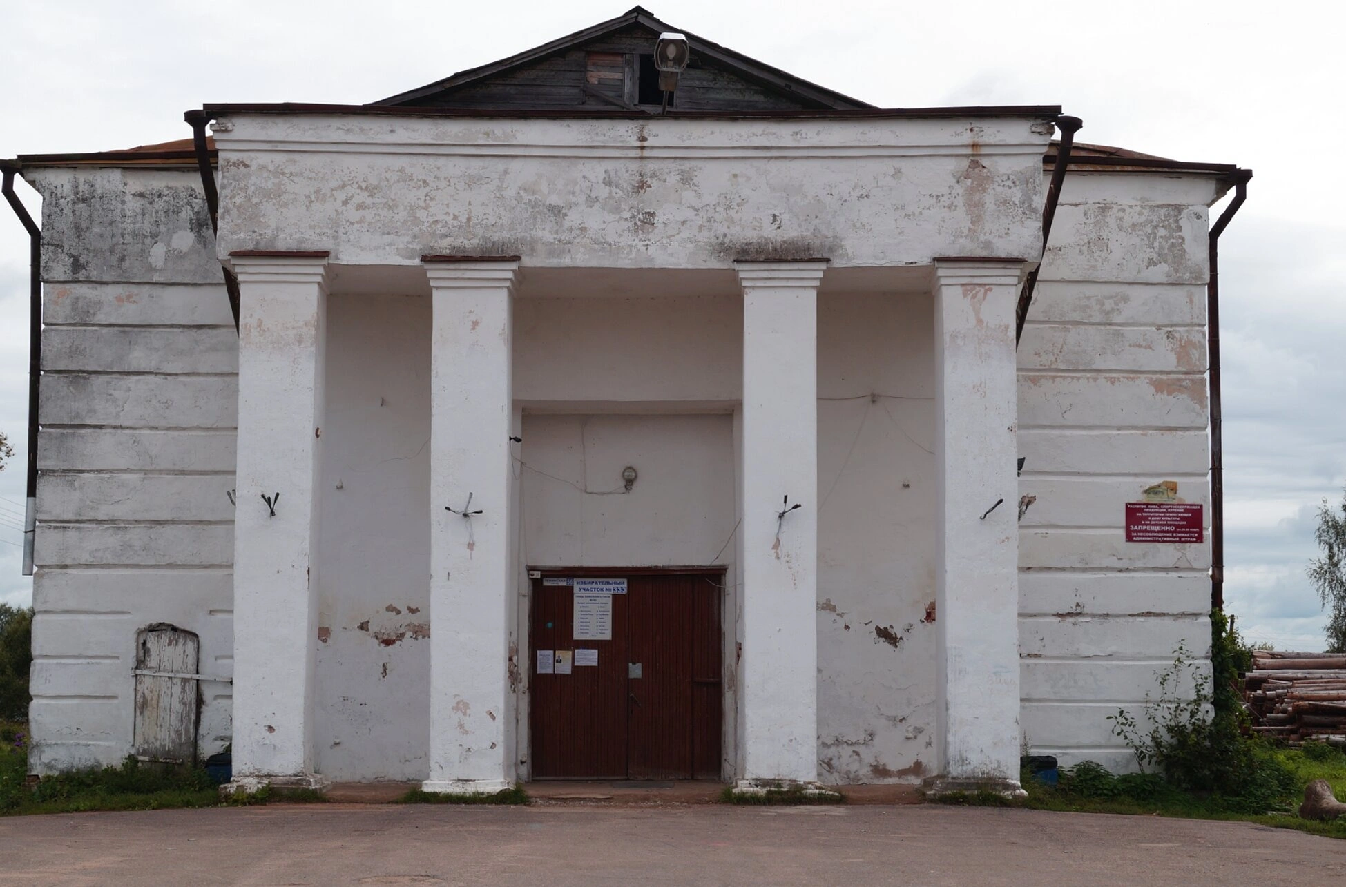 На фотографии хорошо просматриваются детали фасада: массивные деревянные двери, закрытые в момент съёмки, с информационными объявлениями. Справа от входа размещена памятная табличка, а над дверным проёмом сохранился светильник. По сторонам от здания видны хозяйственные постройки и сложенные брёвна, что характерно для сельской местности.
