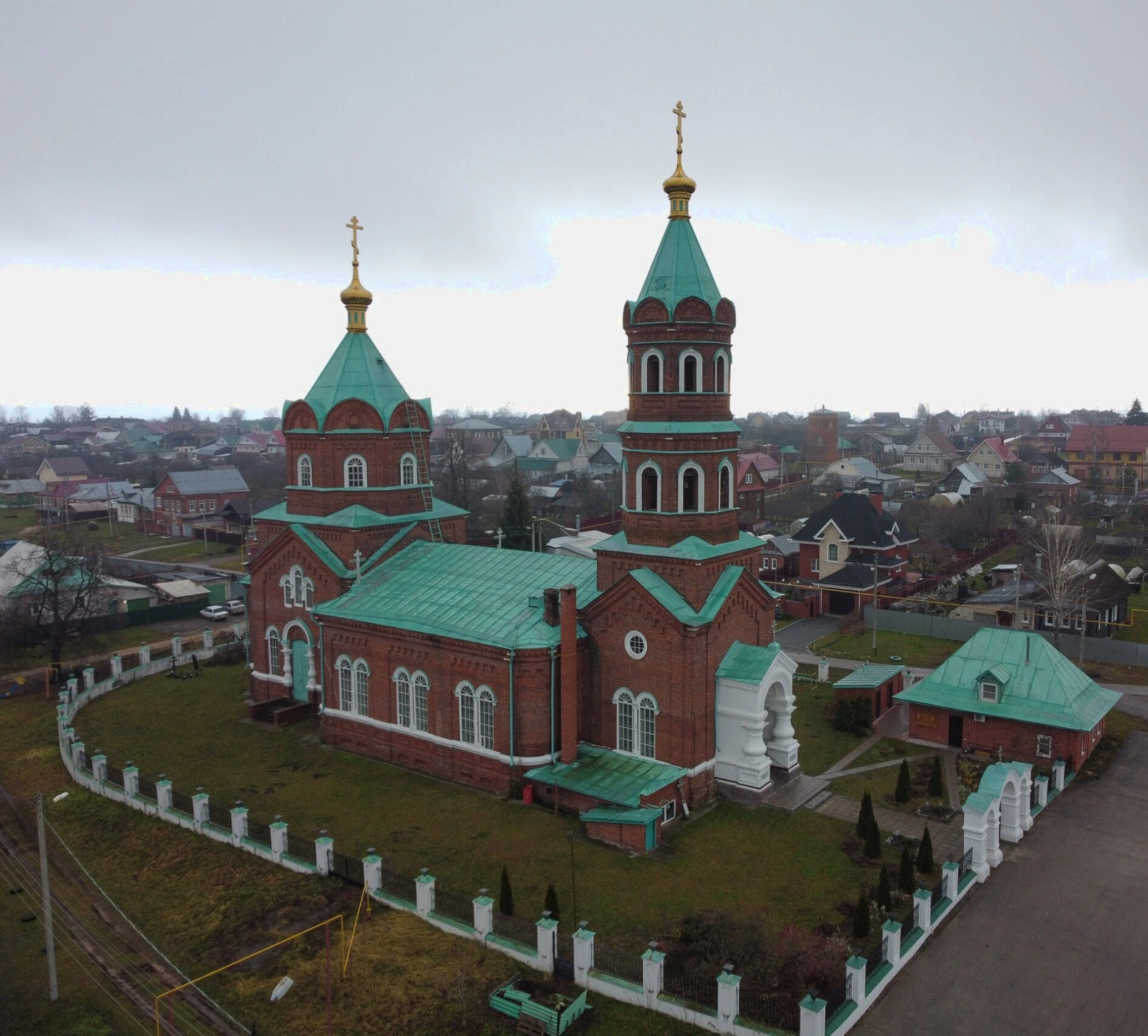 Святыня обнесена аккуратной белой оградой, внутри которой содержится ухоженная территория с зелёным газоном и вспомогательными церковными постройками. Расположение храма в окружении частных домов подчёркивает его неразрывную связь с жизнью православной общины села. Пасмурное небо на фотографии придаёт особое, сдержанное и благоговейное настроение, напоминая о вечном и непреходящем.