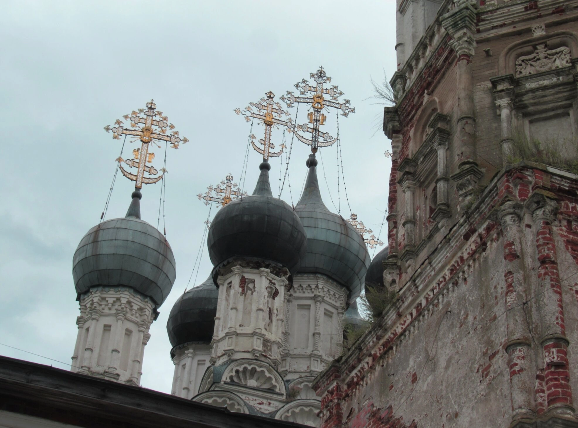 На представленной фотографии запечатлена величественная Троицкая церковь, расположенная в старинном селе Дединово Луховицкого района Московской области. Снимок детально показывает верхнюю часть храмового комплекса, включая его главенствующие купола, увенчанные сияющими православными крестами.