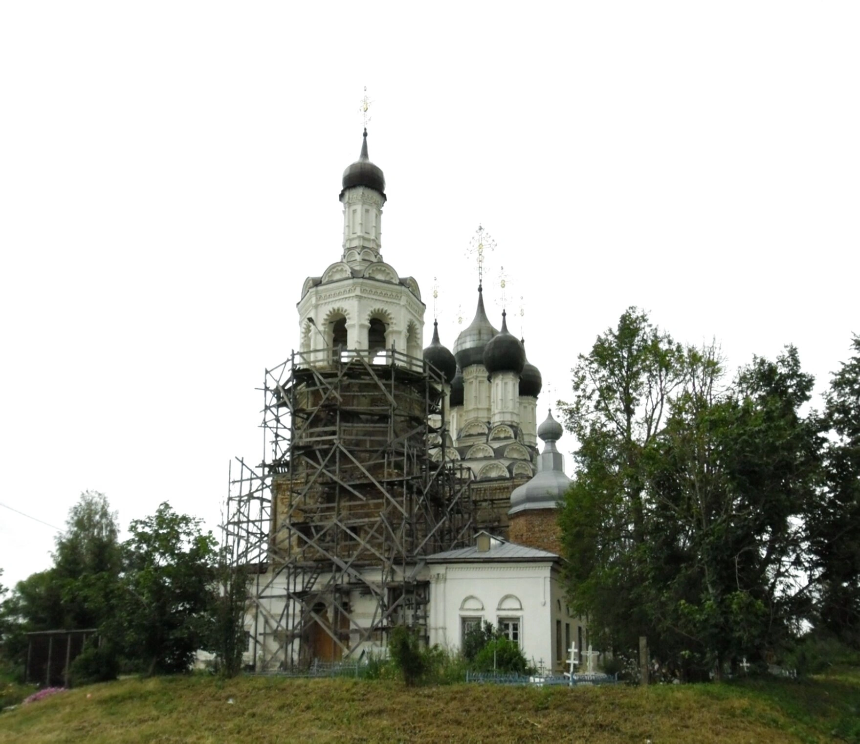 Главный объём храма увенчан традиционным пятиглавием, символизирующим Господа Иисуса Христа и четырёх евангелистов. Рядом возвышается многоярусная колокольня, которая на момент съёмки была окружена строительными лесами, что свидетельствует о проведении благоустроительных работ по её возрождению и укреплению. Эти восстановительные труды предприняты для сохранения уникального архитектурного наследия для будущих поколений.