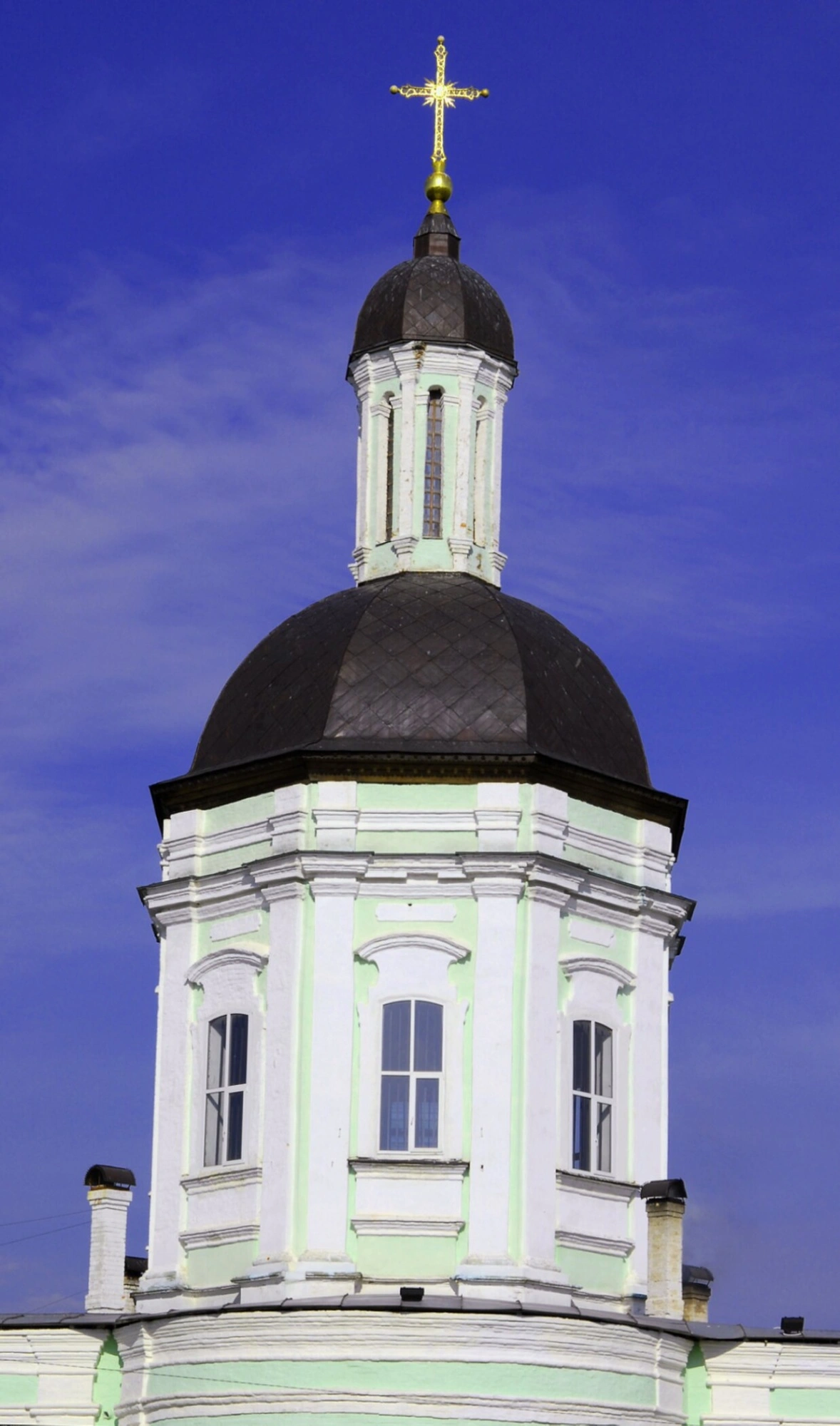 На фотографии запечатлена купольная часть и верхний ярус колокольни Церкви Живоначальной Троицы в селе Ельдигино Пушкинского городского округа Московской области. Этот каменный храм был возведён в 1735 году по повелению и на средства князя Александра Борисовича Куракина, представителя одного из знатнейших родов Российской империи.