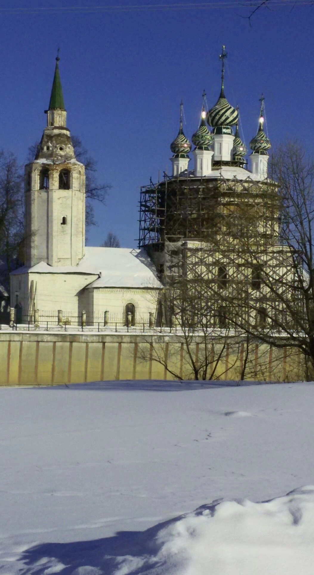 В момент съёмки храм находится в процессе реставрации, о чём свидетельствует установленная вокруг центральной главы строительная опалубка. Эти работы направлены на сохранение уникального архитектурного памятника, являющегося объектом культурного наследия. Рядом с основным объёмом церкви чётко просматривается шатровая колокольня, традиционно завершённая главкой с православным крестом.