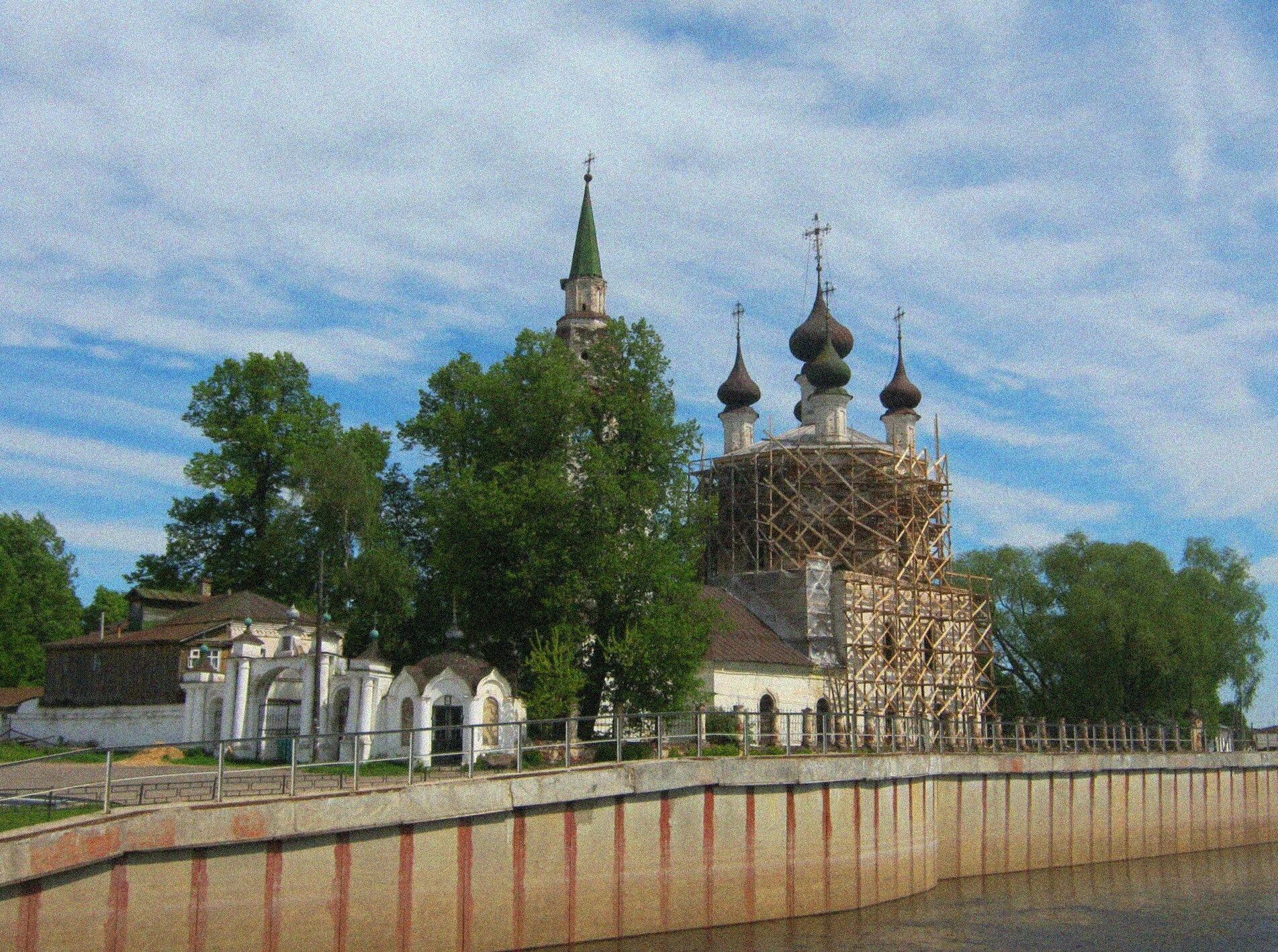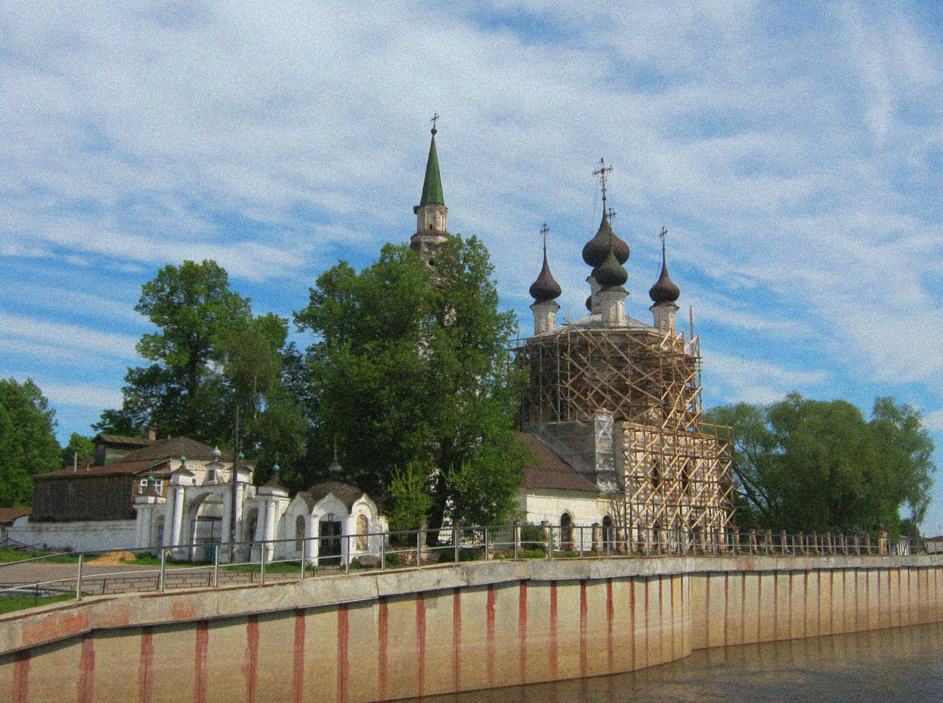 На фотографии запечатлена Троицкая церковь в селе Холуй Ивановской области, расположенная на берегу реки Тезы. Этот храмовый комплекс, включающий летнюю Троицкую и зимнюю Введенскую церкви, представляет собой выдающийся памятник православного зодчества середины XVIII века.
