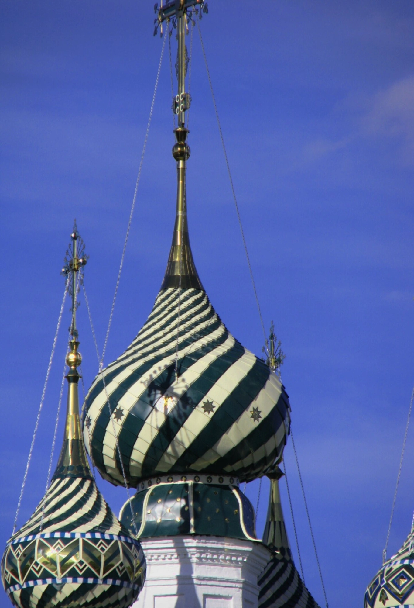 На представленной фотографии запечатлены величественные купола Троицкой церкви, расположенной в старинном селе Холуй Ивановской области. Два купола, выполненные в традиционном русском стиле, возносятся к небесам на фоне ясного голубого неба. Особое внимание привлекает центральный луковичный купол, украшенный чередующимися зелёными и белыми полосами, которые символизируют благодать и чистоту. Золотые звёзды, рассыпанные по его поверхности, напоминают о Вифлеемской звезде, указавшей путь к родившемуся Спасителю, а венчающие купола золочёные кресты свидетельствуют о искупительной жертве Христа.