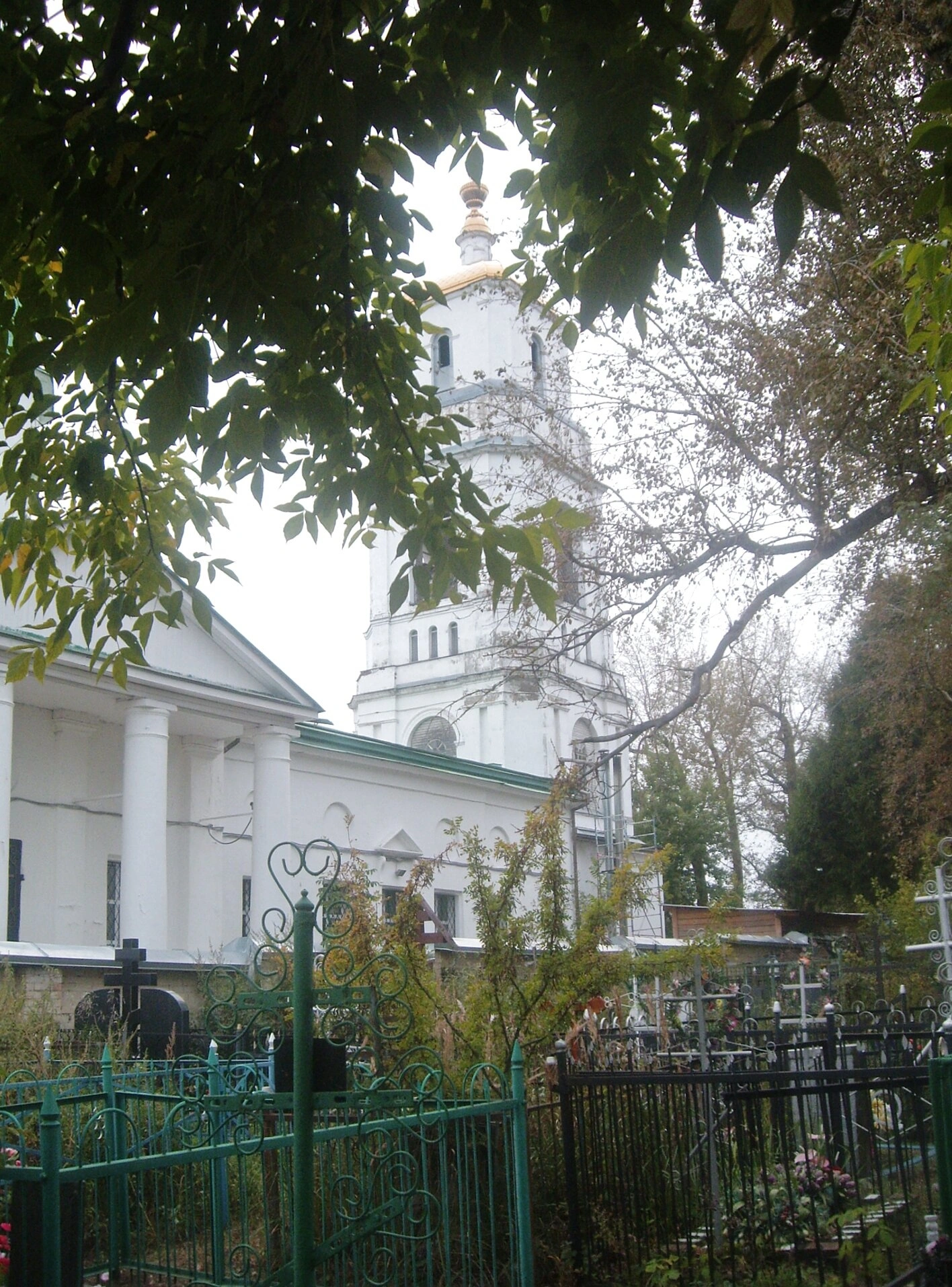 Территория вокруг храма благоустроена и окружена оградой. На переднем плане видны элементы старого кладбища, что свидетельствует о длительной истории этого святого места. Деревья и кустарники, окружающие собор, создают атмосферу умиротворения и покоя, гармонично вписывая храм в природный ландшафт.