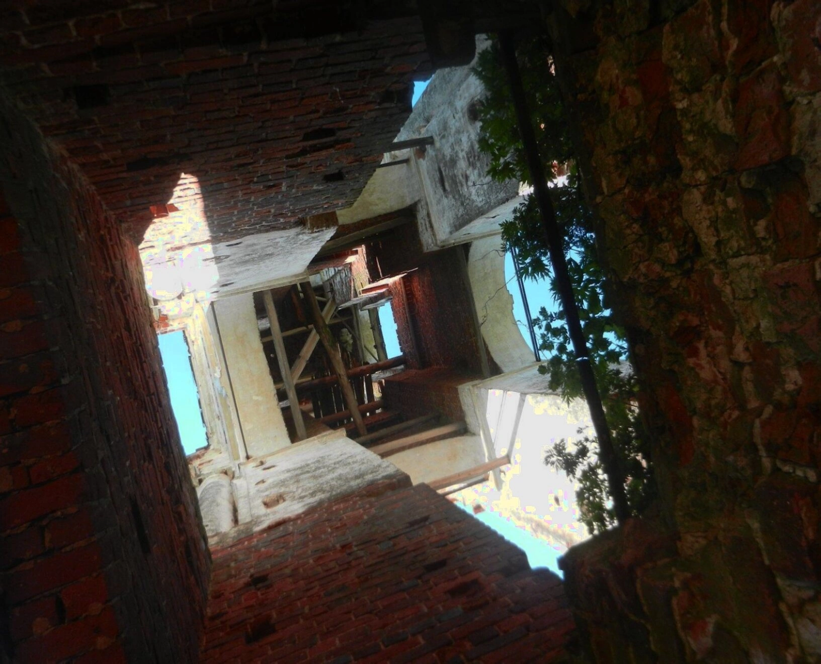 Святыня пребывает ныне в запустении, о чём красноречиво свидетельствует вид изнутри разрушенного здания. Кадр, снятый снизу вверх, открывает взору частично сохранившиеся стены из красного кирпича, чьи поверхности несут следы многолетнего запустения и разрушения. Сквозь провалы в сводах и оконные проёмы, лишённые оконниц, льётся свет небесный, символически напоминая о вечной жизни, не зависящей от тленности земных строений.