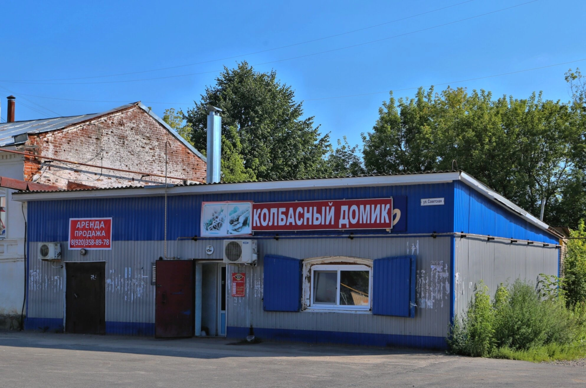 Архитектура здания магазина отличается простотой форм: одноэтажная постройка с синей кровлей и стенами, обшитыми серым металлическим сайдингом. Над входом размещена вывеска с изображением колбасного изделия, а слева от входа расположен информационный щит красного цвета с предложениями об аренде и продаже недвижимости.