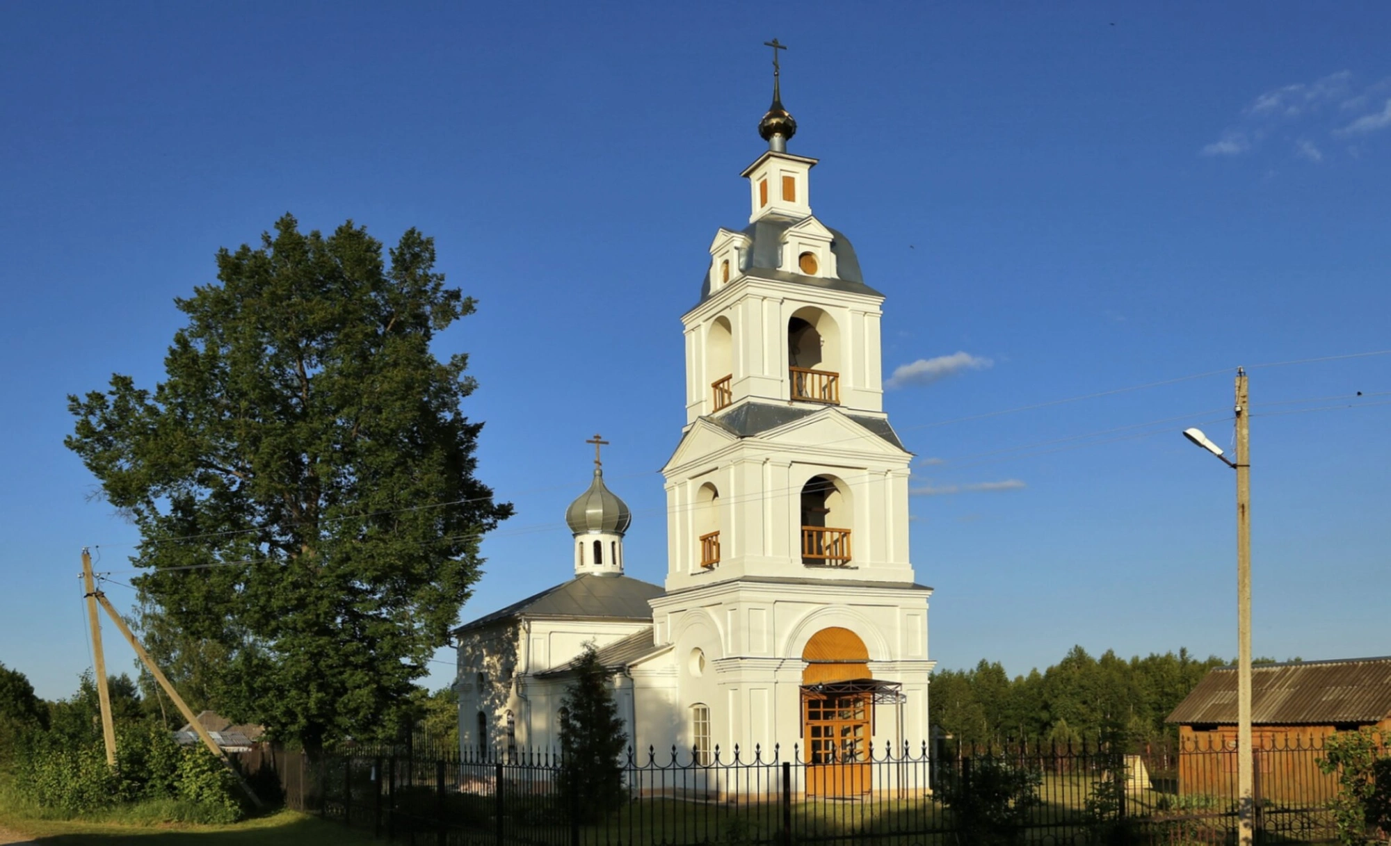На фотографии хорошо просматриваются основные архитектурные элементы: центральный объем с главкой, трапезная часть и многоярусная колокольня, увенчанная шпилем. Отсутствие видимых повреждений на фасаде позволяет предположить, что храм сохранил свою первоначальную архитектурную целостность. Прилегающая территория выглядит ухоженной, что свидетельствует о внимательном отношении к этому историко-культурному памятнику.
