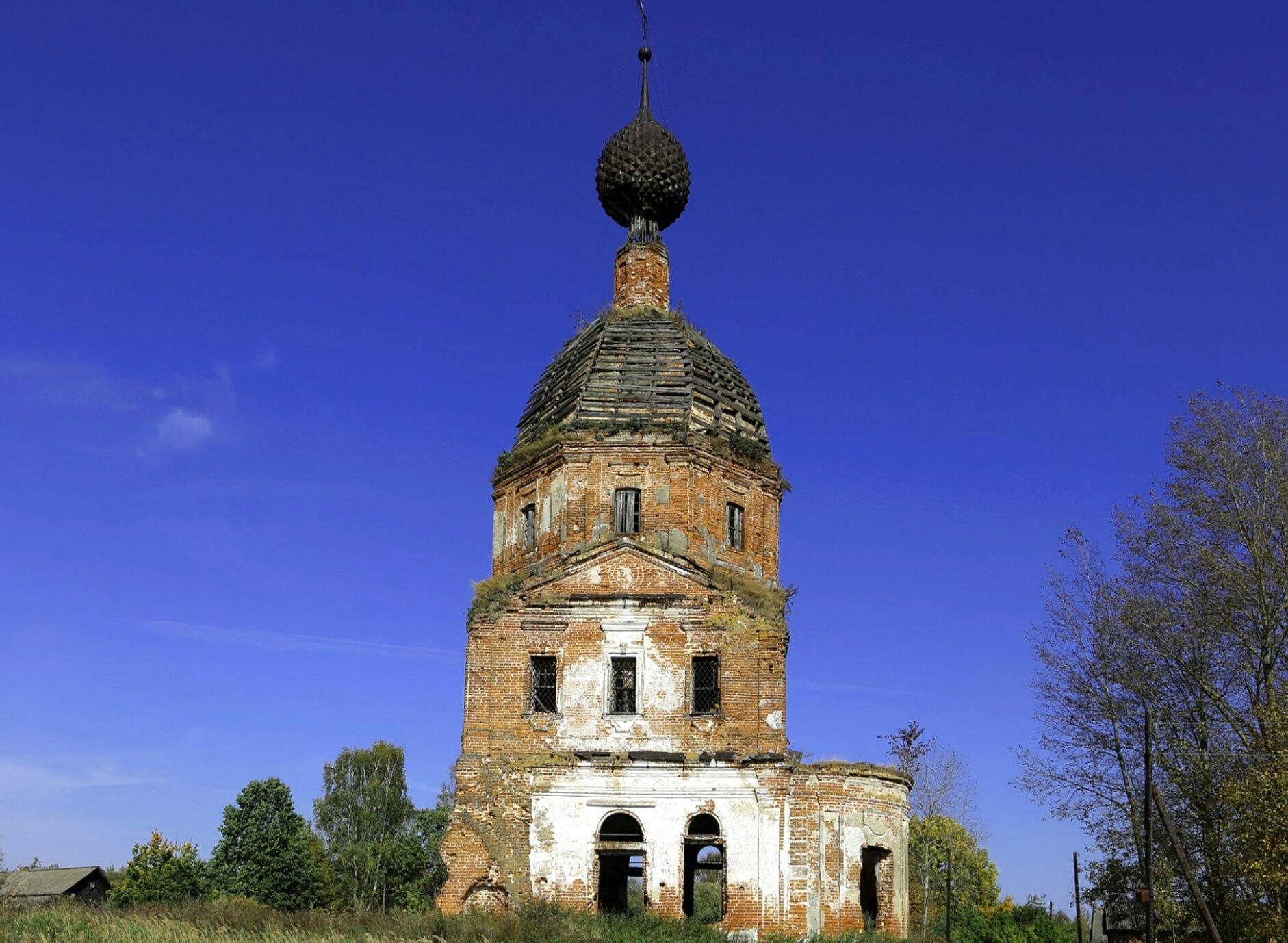 На представленной фотографии запечатлена Троицкая церковь, расположенная в селе Назорное Ильинского района. Храм находится в полуразрушенном состоянии, что придает ему особое историческое звучание и напоминает о непростой судьбе православных святынь в российской провинции.