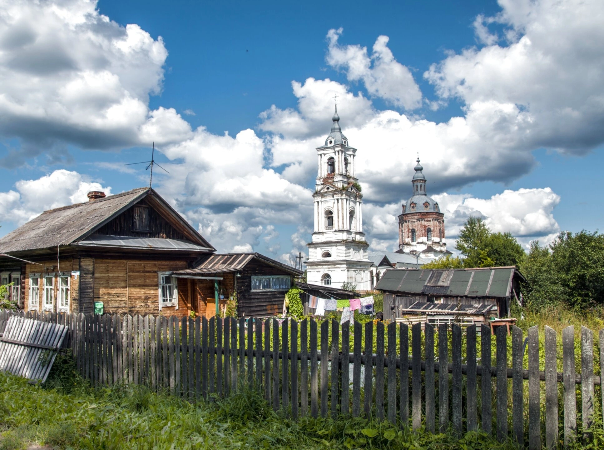 Доминантой композиции является величественная Троицкая церковь — выдающийся памятник архитектуры переходного периода от барокко к классицизму. Белокаменная колокольня, устремлённая ввысь, замыкает перспективу главной улицы села. Её ярусы, украшенные колоннами и арками, венчает высокий шпиль с крестом. Справа виден основной объём храма с восьмериком, увенчанным луковичным куполом терракотового цвета. Этот каменный храм, построенный по проекту архитектора В. И. Кафтырева в 1782–1796 годах, стал воплощением мастерства вятских зодчих под руководством Данилы Горынцева.