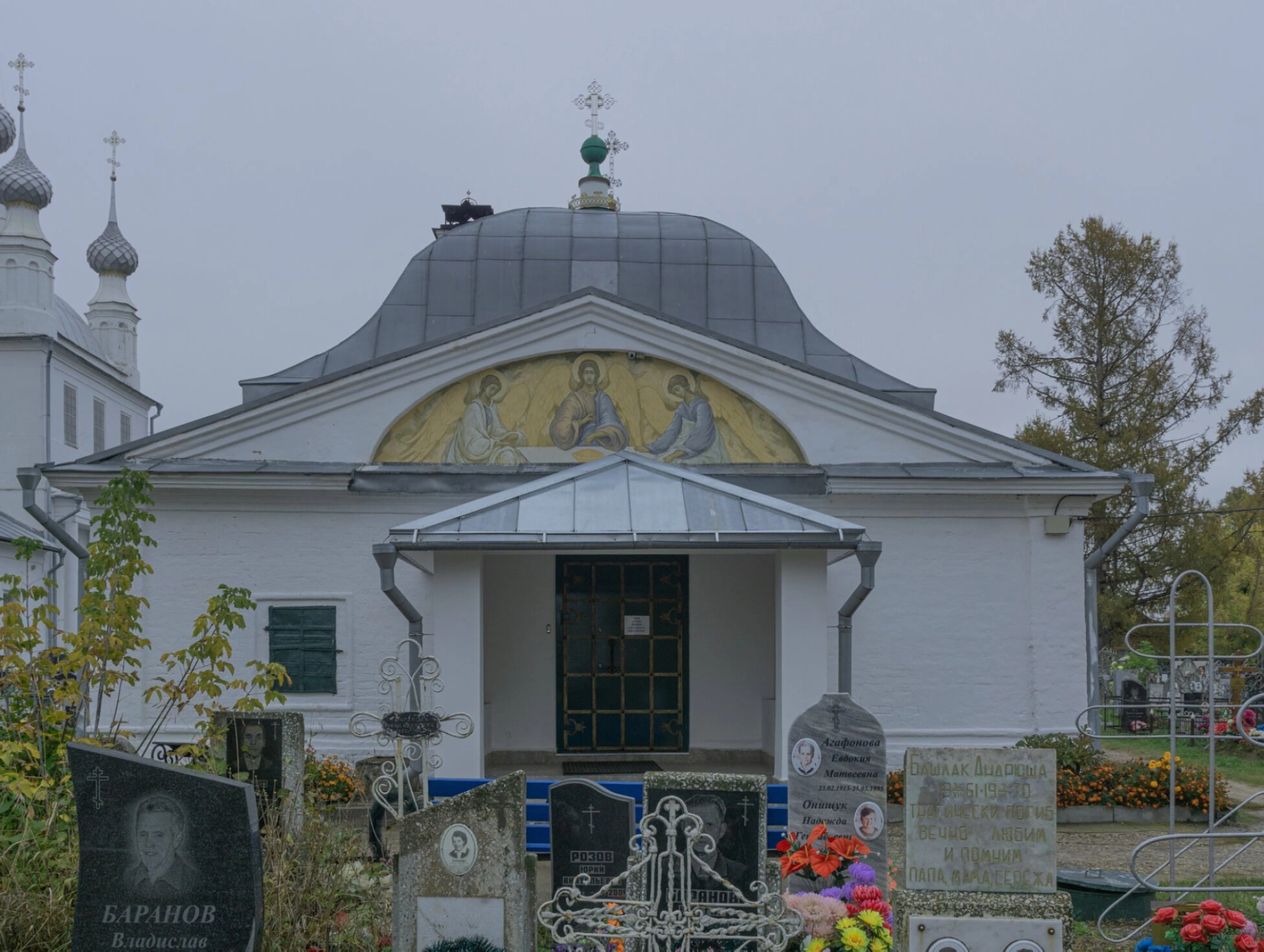 На переднем плане открывается вид на старинное прицерковное кладбище, где покоятся благочестивые жители этих мест. Многочисленные каменные надгробия и кресты, поросшие мхом, свидетельствуют о многовековой истории этого святого места и придают пейзажу особое благоговение и память о предках.