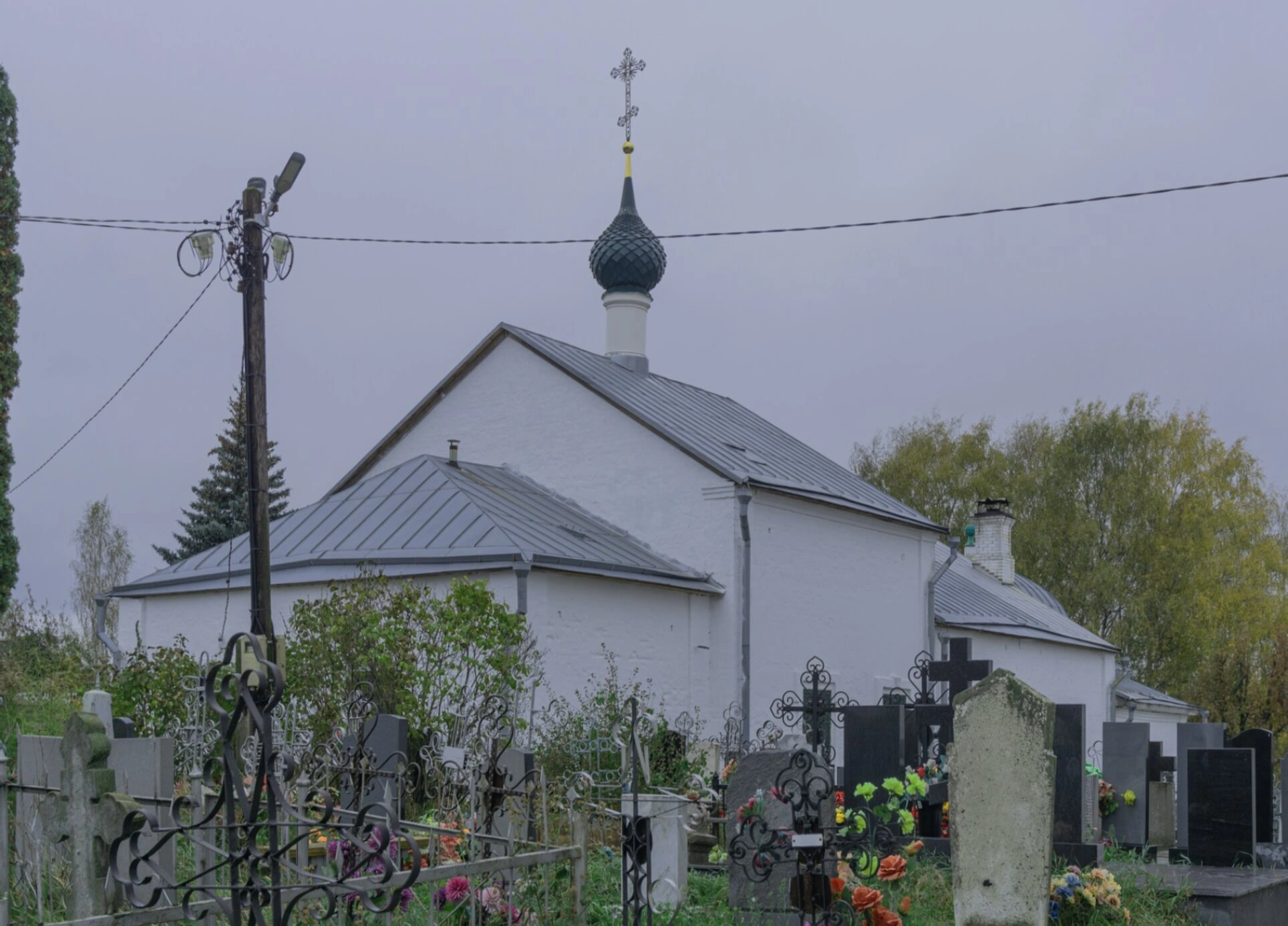 На переднем плане фотографии видно прихрамовое кладбище, что является неотъемлемой частью православной традиции, символизирующей единство живых и усопших в лоне Церкви. Территория ухожена, что свидетельствует о заботе местной общины о святом месте.