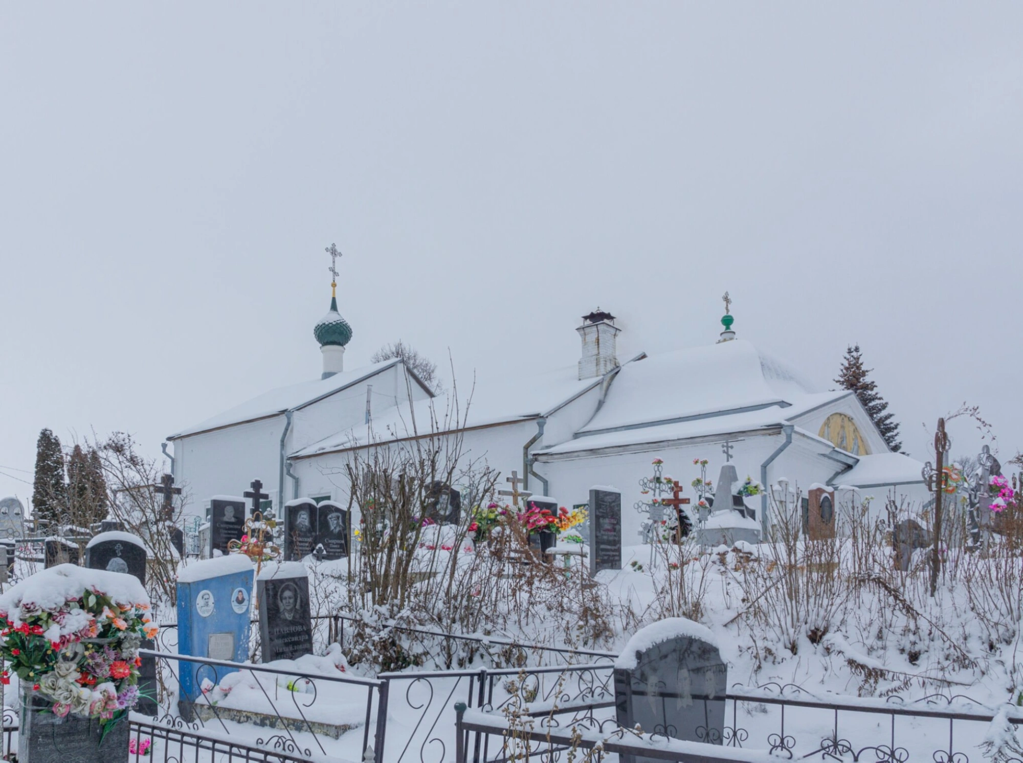 Церковь окружена древним кладбищем, где под снежным покровом виднеются многочисленные надгробия, кресты и памятники. Некоторые из них украшены венками и искусственными цветами, чьи яркие краски трогательно выделяются на фоне белоснежного пейзажа, напоминая о вечной памяти и надежде на воскресение. Данный вид с северо-запада позволяет оценить архитектурную гармонию храма и его органичную связь с окружающим миром, где природа и история существуют в неразрывном единстве.
