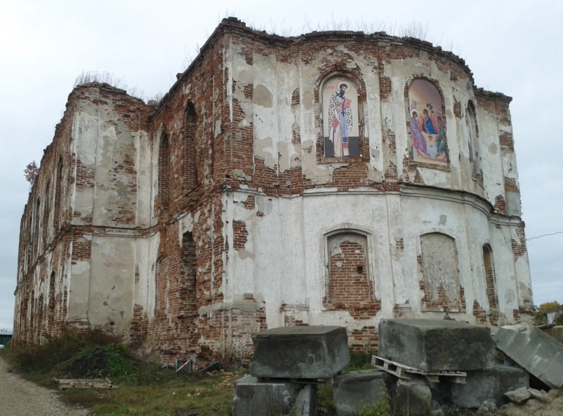 На представленной фотографии запечатлён полуразрушенный Свято-Троицкий храм, расположенный в селе Вазерки Бессоновского района Пензенской области. Этот некогда величественный кирпичный храм, ныне пребывающий в руинированном состоянии, является скорбным напоминанием о утраченном духовном наследии и сложной истории XX века.