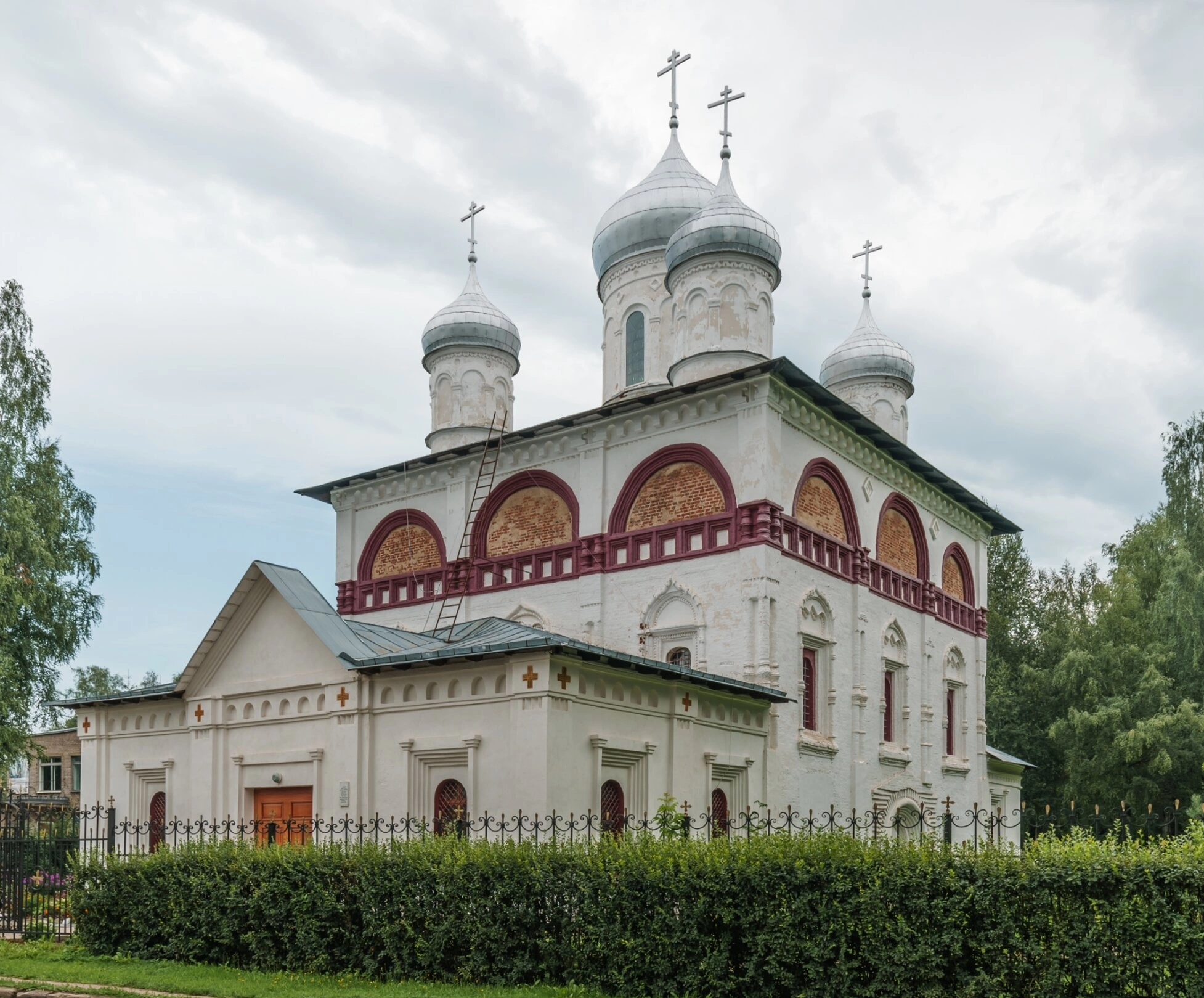 На представленной фотографии запечатлён старинный православный храм — Церковь Святой Живоначальной Троицы, что располагается в древнем городе Старая Русса Новгородской области. Святыня, возведённая в конце XVII века на месте более древнего храма, является выдающимся памятником русской церковной архитектуры и объектом культурного наследия.