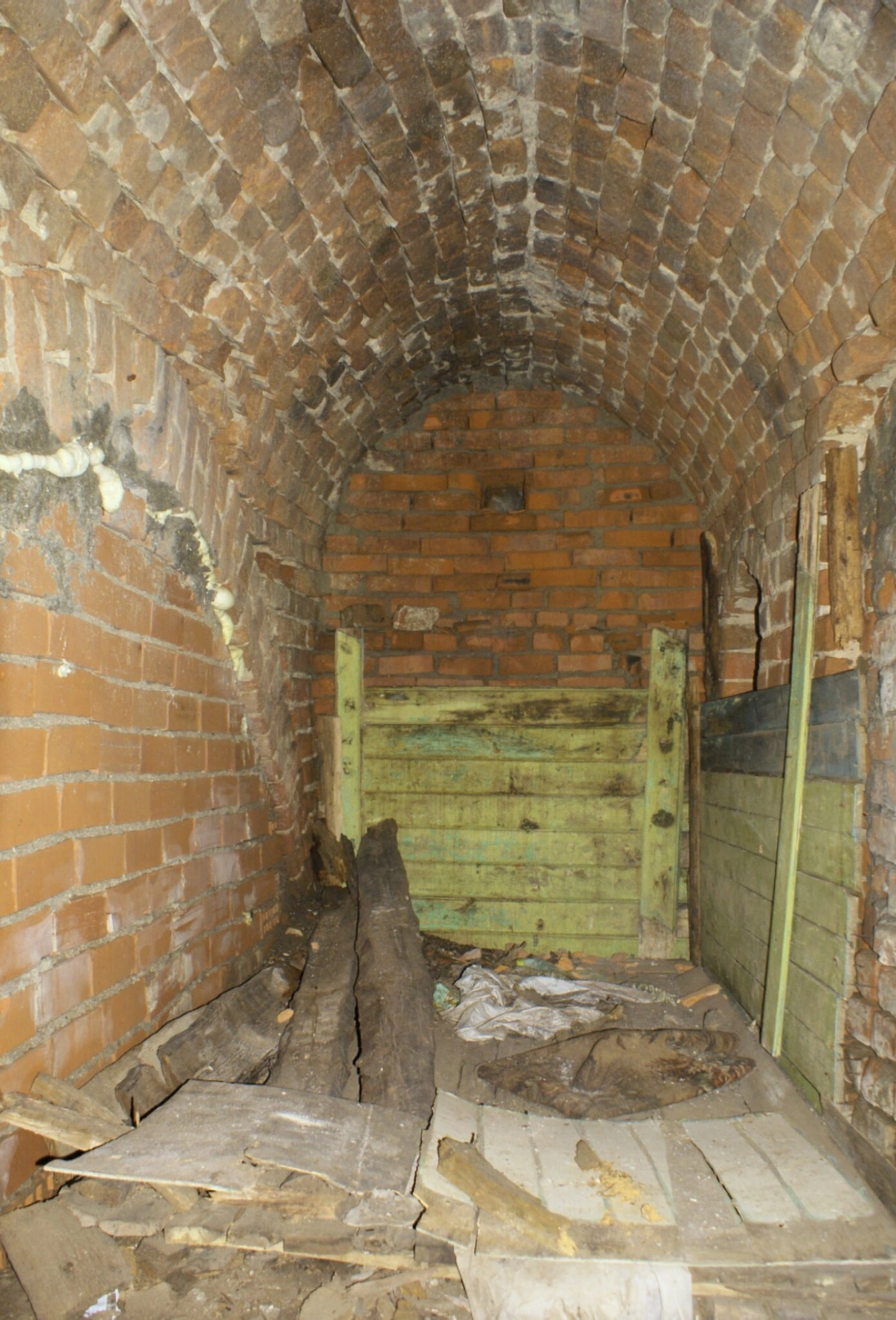 Особого внимания заслуживает архитектурное решение сводчатого потолка, характерное для подвальных или цокольных помещений православных храмов. Подобные пространства часто использовались для хозяйственных нужд либо служили нижними ярусами церковных сооружений. Пол помещения также выложен кирпичом, но более плоской формы, что соответствует строительным нормам того времени.