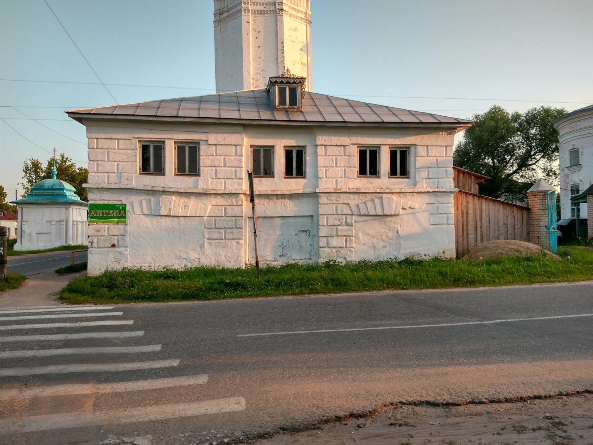 На переднем плане фотографии видно двухэтажное белое здание с четкой надписью «АПТЕКА» на фасаде, которое гармонично вписывается в историческую застройку поселения. За ним возвышается стройная колокольня Троицкой церкви, увенчанная традиционным православным крестом, устремленным к небесам. Слева от основного здания просматривается небольшая культовая постройка с синим куполом, характерным для русского церковного зодчества.