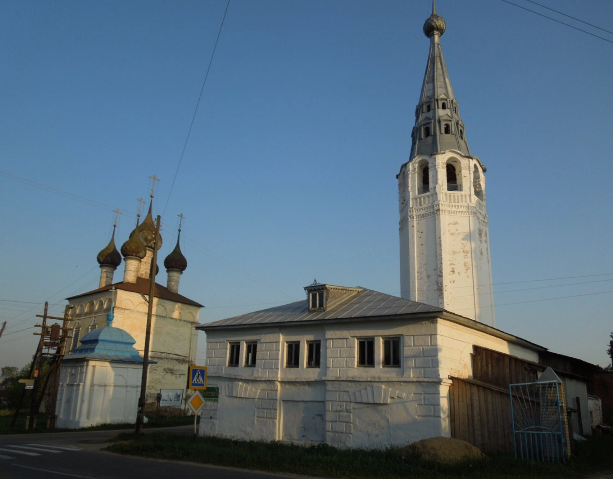 На фотографии запечатлён величественный архитектурный ансамбль в селе Писцово Комсомольского района Ивановской области. Центральным элементом композиции является Собор Троицы Живоначальной, известный как летняя церковь, — выдающийся памятник православного зодчества и объект культурного наследия федерального значения.