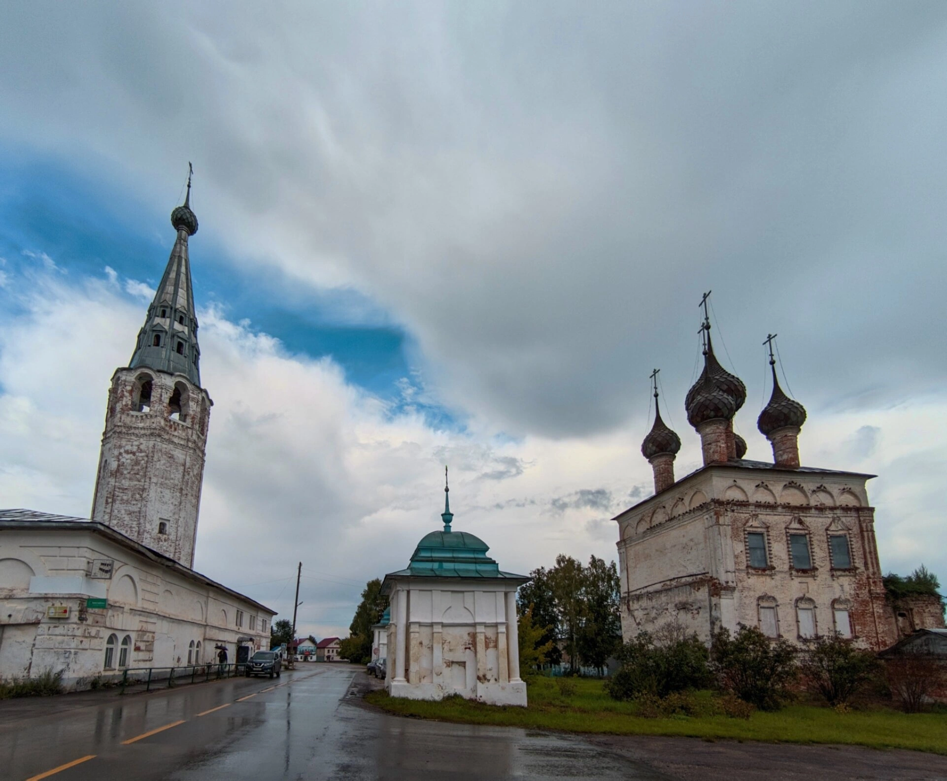 На представленной фотографии запечатлена летняя Троицкая церковь в селе Писцово Комсомольского района Ивановской области. Этот величественный храм является выдающимся памятником православной архитектуры второй половины XVIII века и составляет единый ансамбль с зимней Церковью Рождества Пресвятой Богородицы.