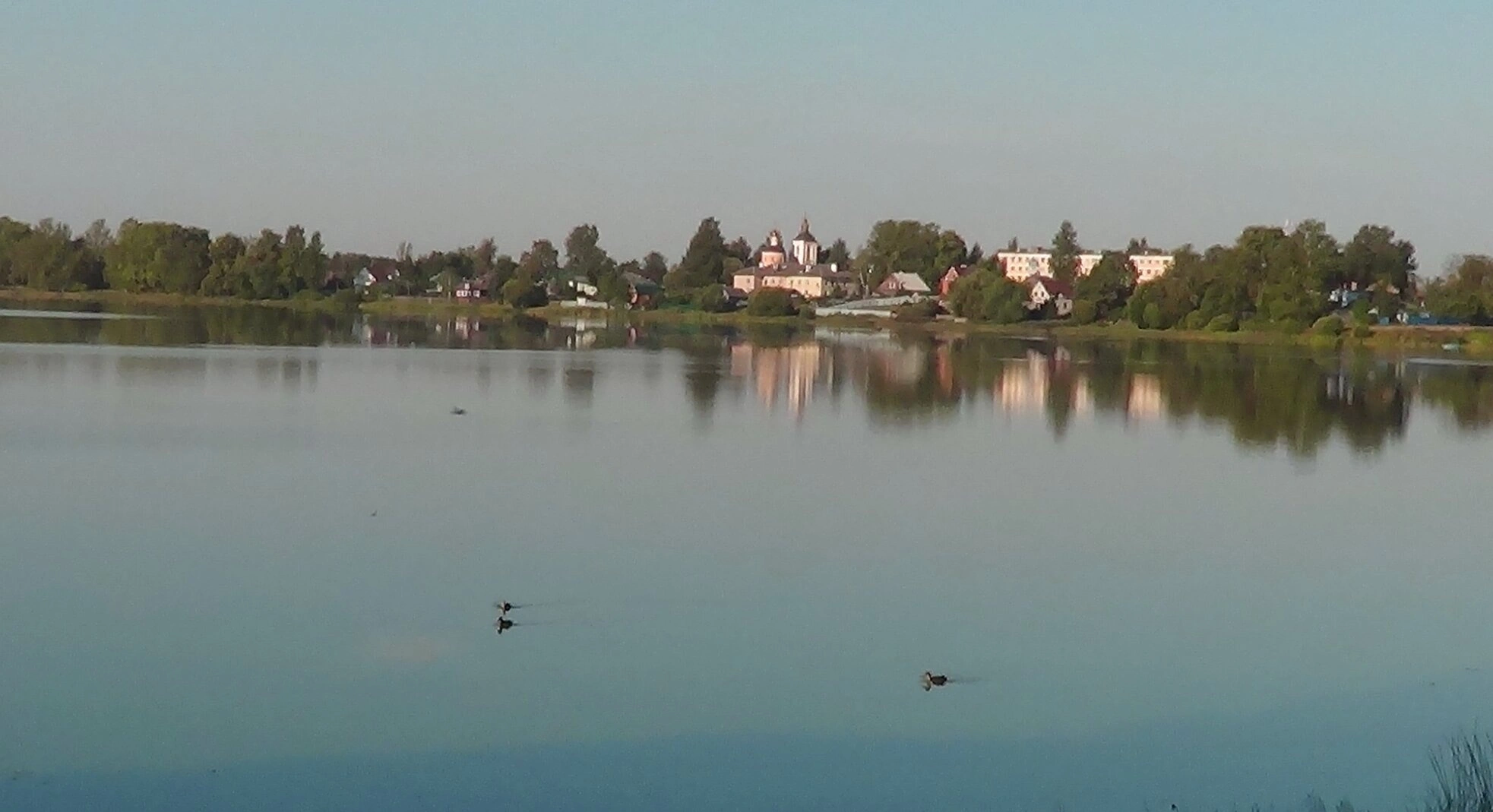 На переднем плане фотографии видна спокойная гладь озера Веребье, отражающая благолепие церковных глав. Водная стихия подчеркивает умиротворенность и духовную значимость этого места. Храм окружен вековыми деревьями и скромными городскими постройками, что создает ощущение единения природы и человеческого духа.