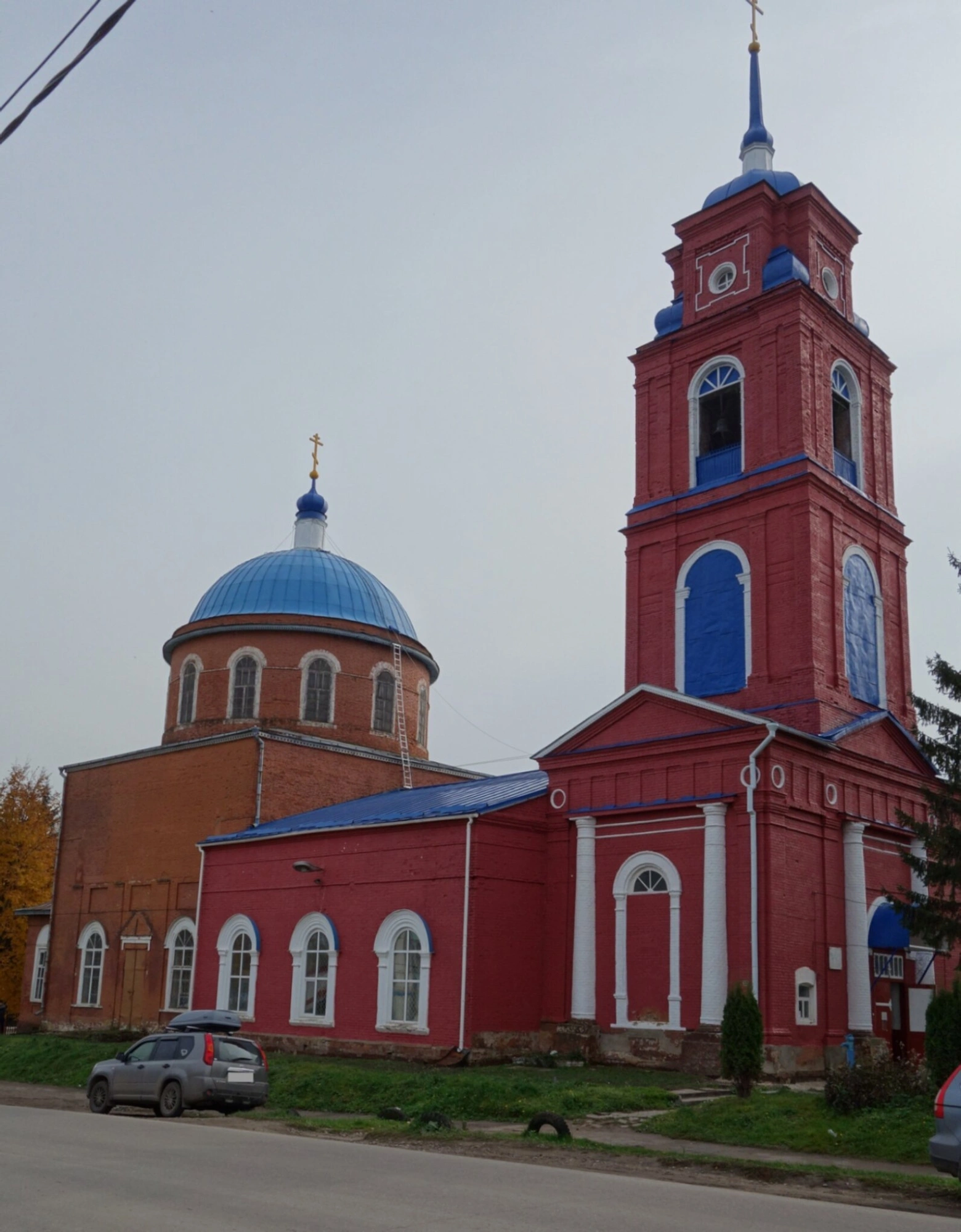 На представленной фотографии запечатлён Свято-Троицкий храм, расположенный в историческом посёлке Одоев Тульской области. Храм является значимым духовным центром и памятником церковной архитектуры своего времени.