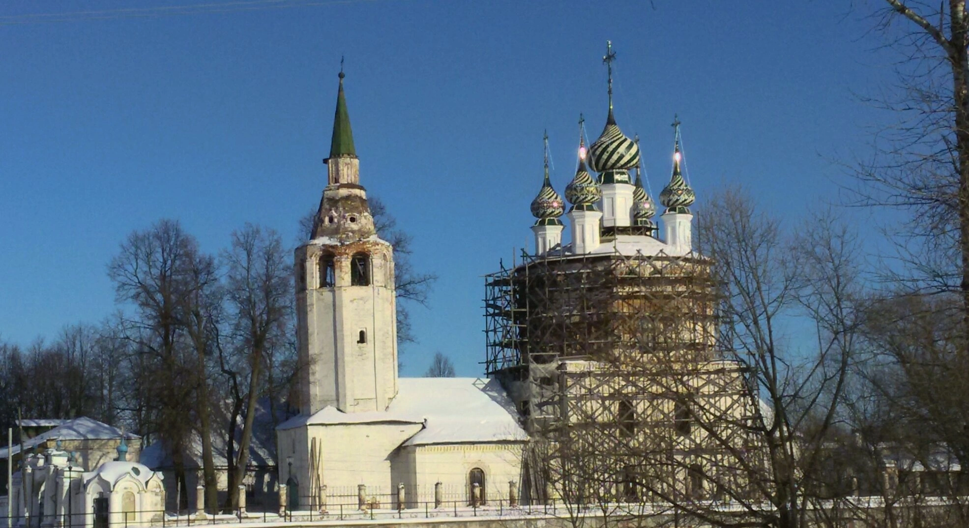 Храмовый комплекс пребывает в стадии активной реставрации. Центральный объём, увенчанный традиционными золочёными луковичными главами, основательно окружён строительными лесами, что говорит о проводимых работах по восстановлению его былого благолепия. Рядом высится стройная колокольня, завершающаяся остроконечным шатром, который является характерным элементом русской церковной архитектуры.
