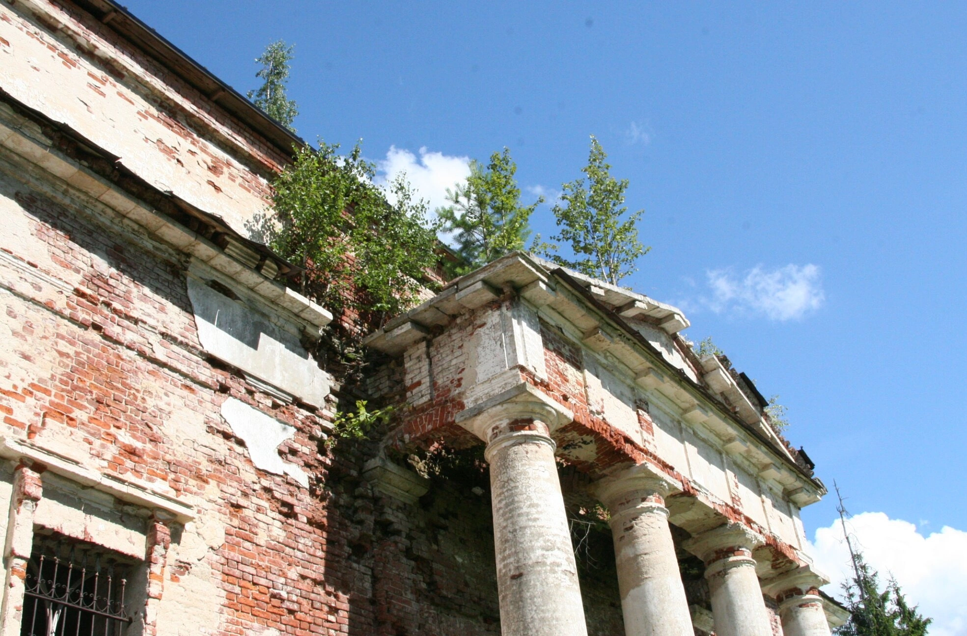 На представленной фотографии запечатлены скорбные руины Свято-Троицкого храма, некогда величественного православного сооружения в селе Микшино Тверской губернии. Храм был возведён в XIX веке во имя Святой Живоначальной Троицы и являлся духовным центром для жителей окрестных деревень.