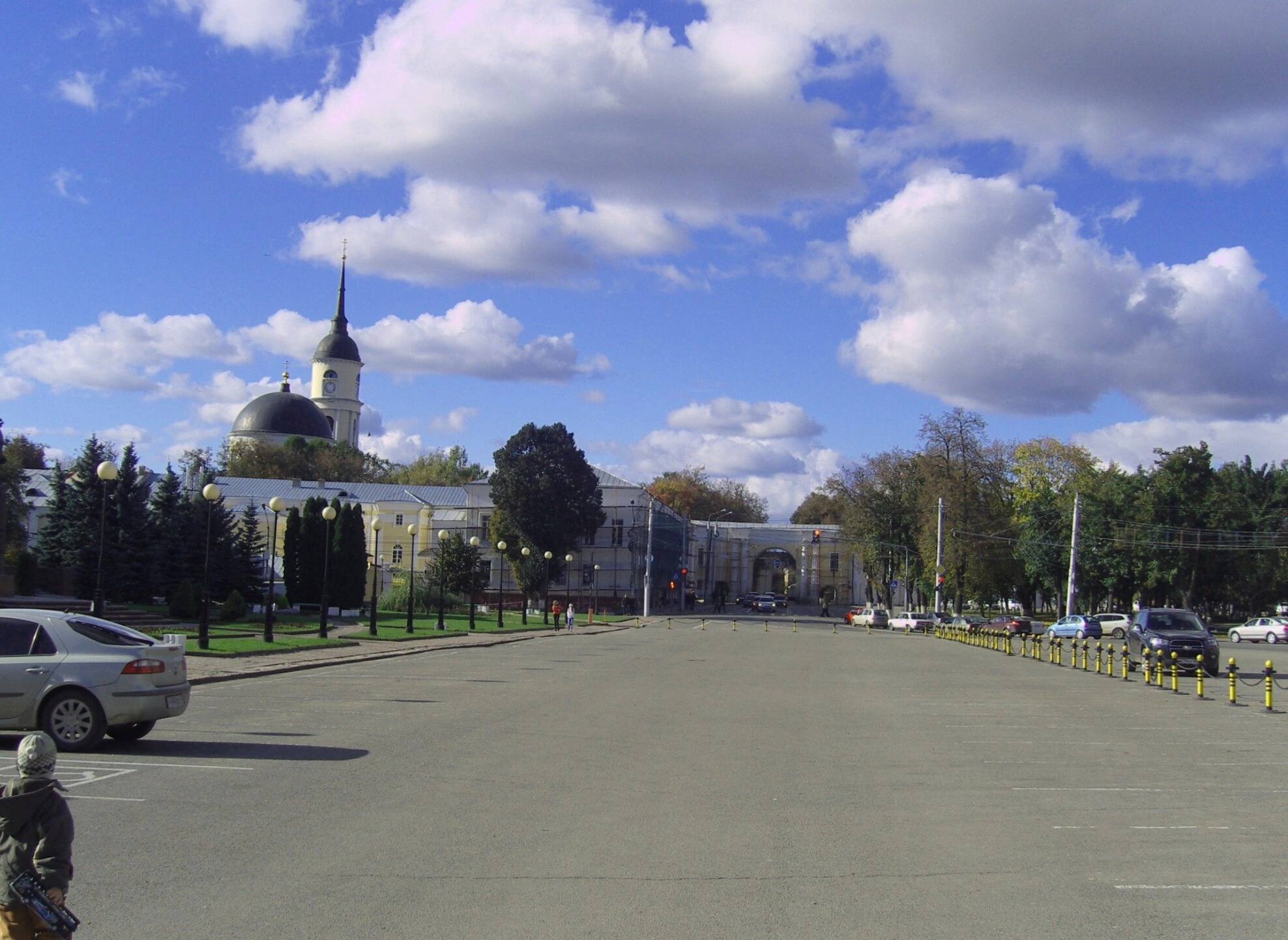На представленной фотографии запечатлён духовный и административный центр древнего города Калуги — площадь Старый Торг с возвышающимся над ней величественным Троицким кафедральным собором. Священный купол и колокольня собора, увенчанные златоглавыми крестами, доминируют в панораме, символизируя неразрывную связь истории города с православной верой.