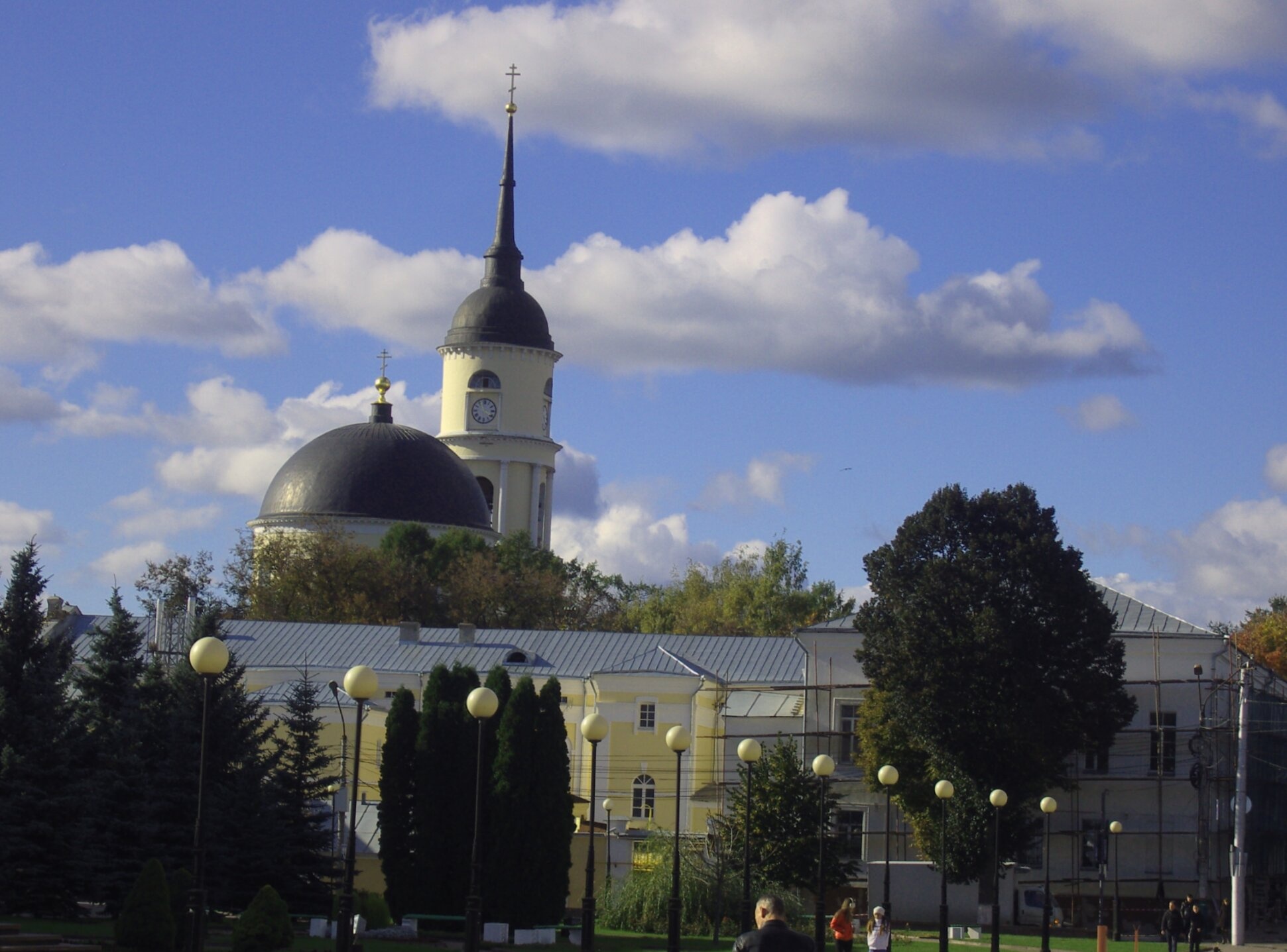 На представленной фотографии запечатлён величественный Троицкий кафедральный собор, являющийся одной из главных православных святынь города Калуги. Монументальное здание собора, увенчанное массивным золотым куполом, доминирует в архитектурном ансамбле площади Победы и является символом духовного возрождения города.