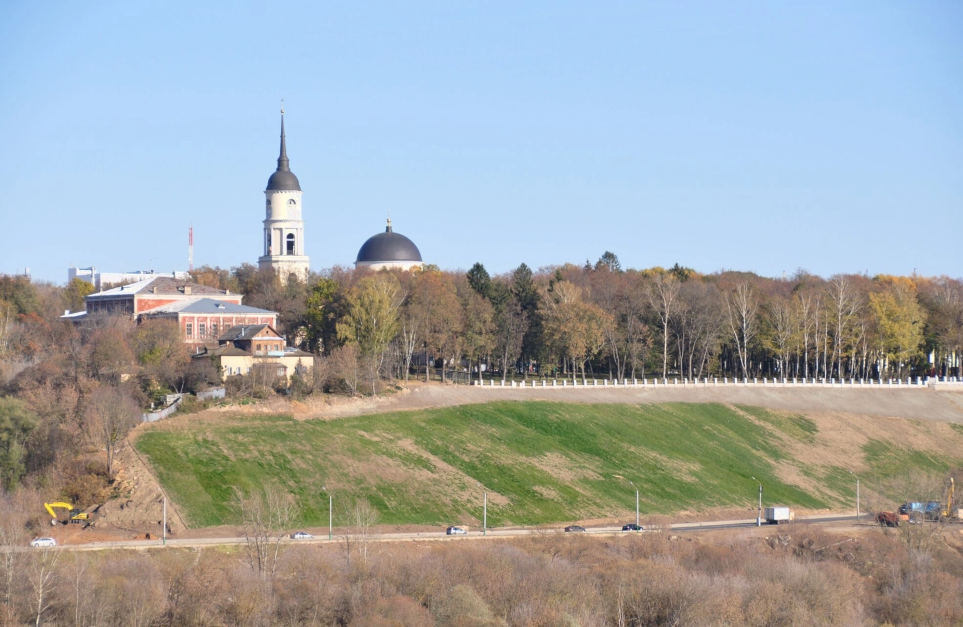 На представленной фотографии запечатлён величественный вид на ансамбль Троицкого кафедрального собора, являющегося архитектурной доминантой исторического центра города Калуги. Снимок сделан с возвышенности, что позволяет оценить монументальность святого места и его гармоничное единение с окружающим ландшафтом.
