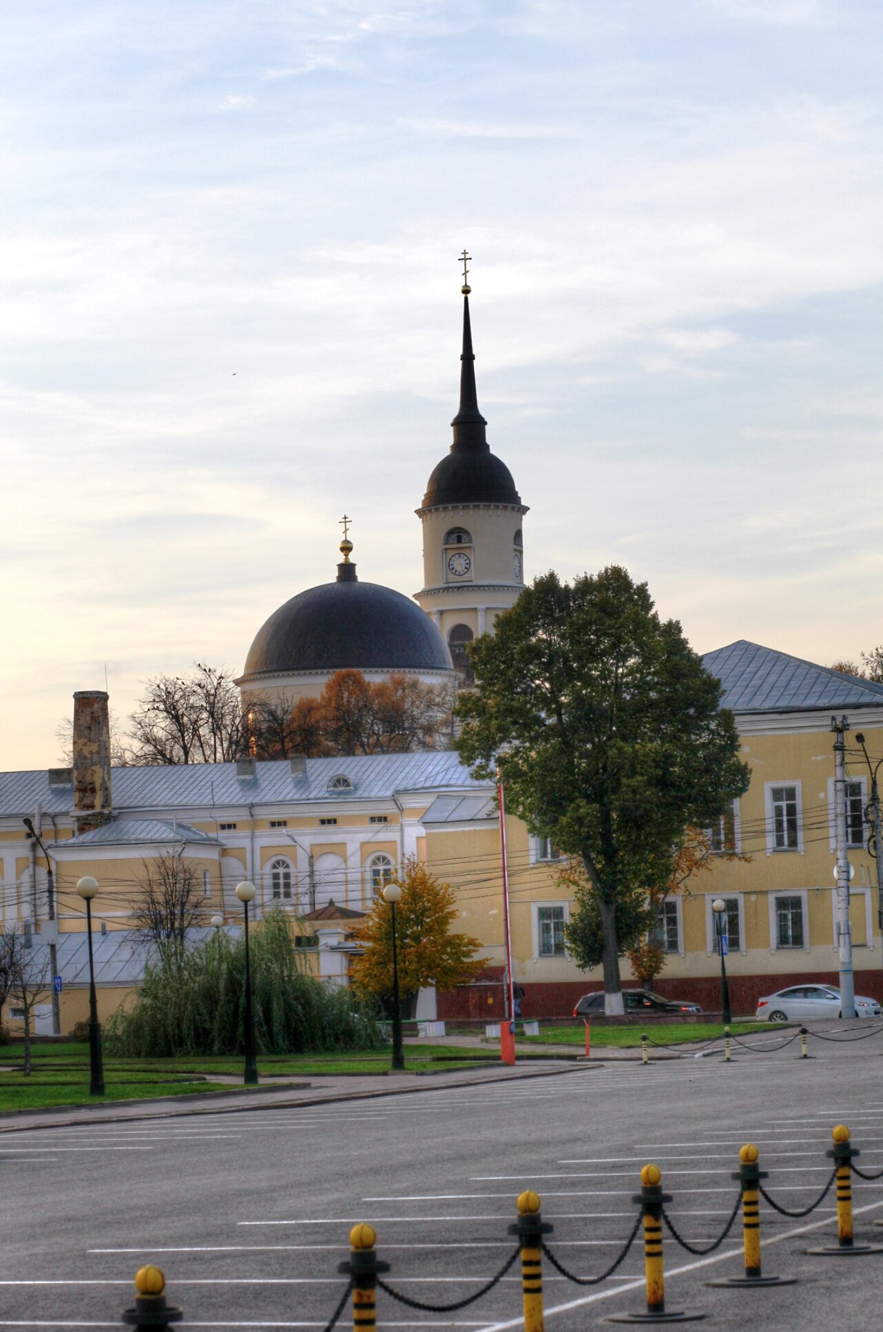 На переднем плане фотографии расположен комплекс зданий Присутственных мест, построенный в 1780-х годах по проекту губернского архитектора П.Р. Никитина в стиле строгого классицизма. Этот административный ансамбль был возведён на месте сгоревшего деревянного кремля и органично вписался в новый градостроительный план Калуги. Его лаконичные формы и симметричные линии служат идеальным обрамлением для духовного центра города.