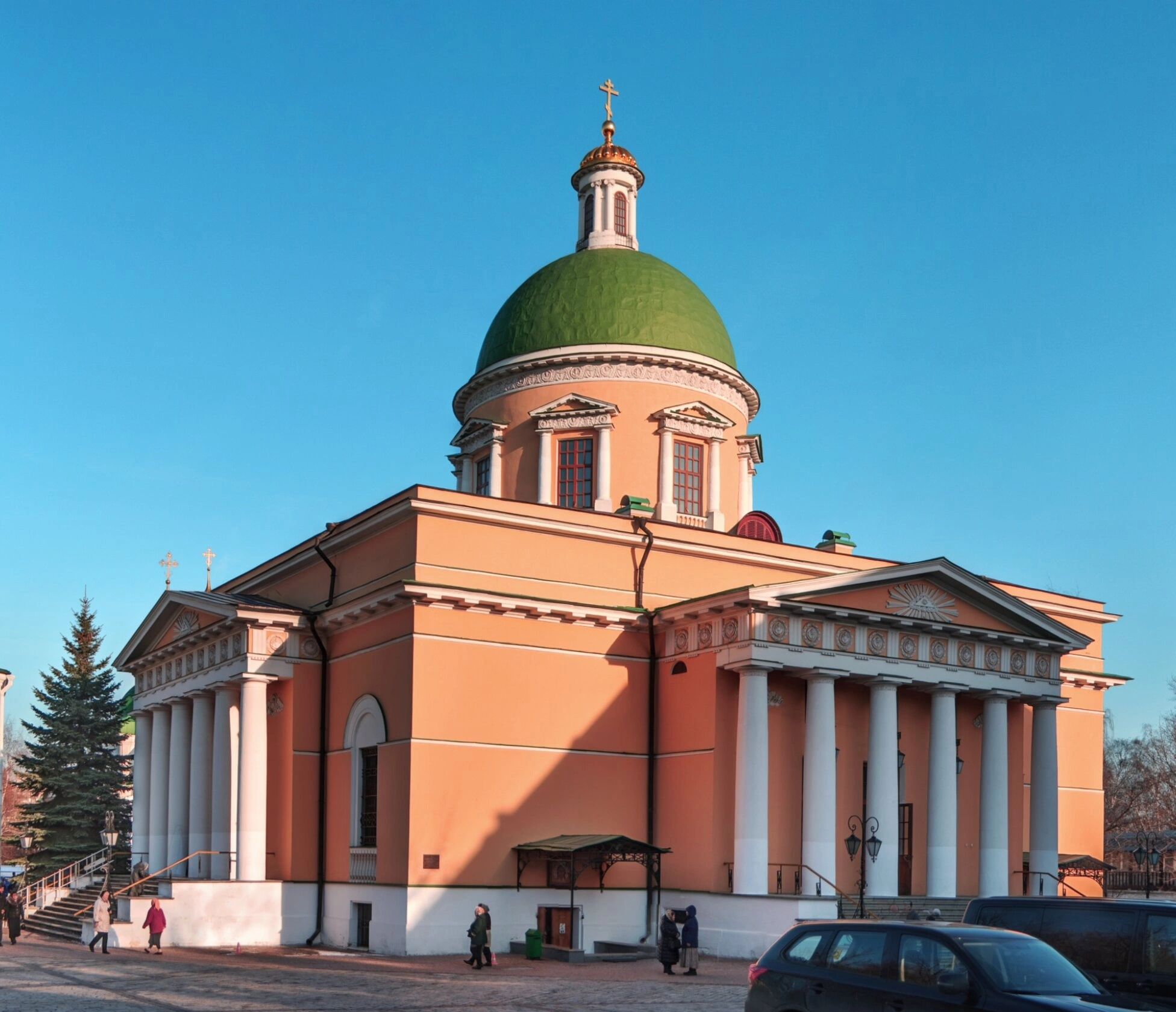 Собор был возведён в 1833–1838 годах по проекту известного архитектора Осипа Бове на средства, пожертвованные купцами Куманиными и Шустовыми. Освящение храма состоялось 13 сентября 1838 года. Здание отличается монументальностью форм и гармонией пропорций. Фасад собора, выкрашенный в золотисто-жёлтый цвет, украшен белоснежной колоннадой и богатым лепным декором. Над основным объёмом храма возвышается мощный световой барабан, прорезанный арочными окнами и увенчанный зелёной главой с сияющим золотым крестом.