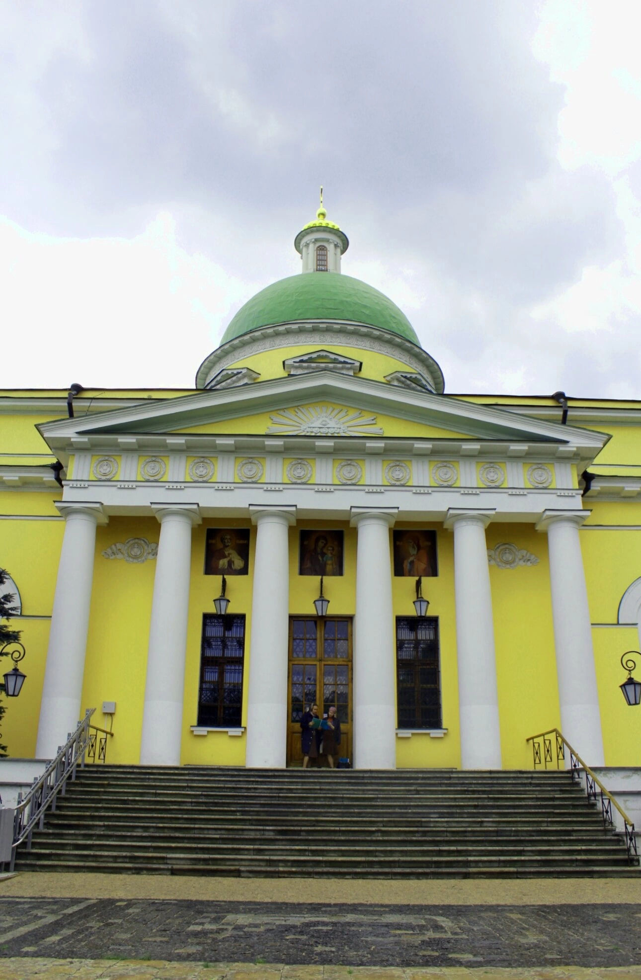На представленной фотографии запечатлён величественный Троицкий собор, являющийся главным храмом Свято-Данилова ставропигиального мужского монастыря в Москве. Собор освящён во имя Святой Живоначальной Троицы и представляет собой выдающийся памятник церковной архитектуры эпохи зрелого классицизма.