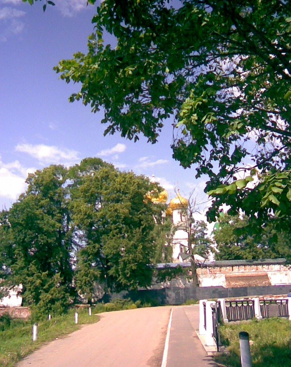 На переднем плане фотографии видна дорога с пешеходной дорожкой, ведущая паломников и верующих к вратам монастыря. С правой стороны изображения находится каменная ограда с изящными металлическими перилами, характерная для церковной архитектуры.