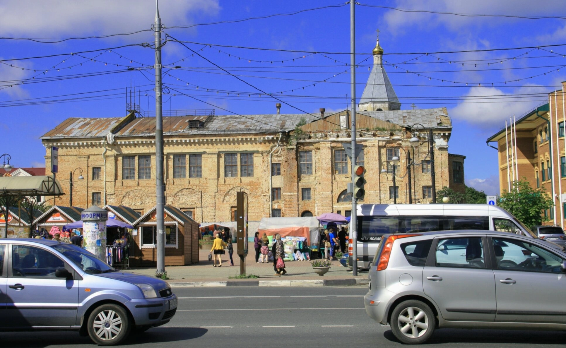 Собор, являвшийся на протяжении столетия центром духовной жизни всего Клинского края, пережил тяжёлые времена поругания, но в 2008 году был возвращён Русской Православной Церкви. На фотографии, сделанной, по всей видимости, в период, когда богослужения в его стенах ещё не возобновились, он предстаёт как незыблемая историческая доминанта, вокруг которой продолжается мирская жизнь. Справа от храма виден современный жилой дом, что подчёркивает связь времён и поколений. Солнечный свет, падающий на фасады, и голубое небо над городом наполняют снимок ощущением тихого, провинциального спокойствия, характерного для старинных русских городов.